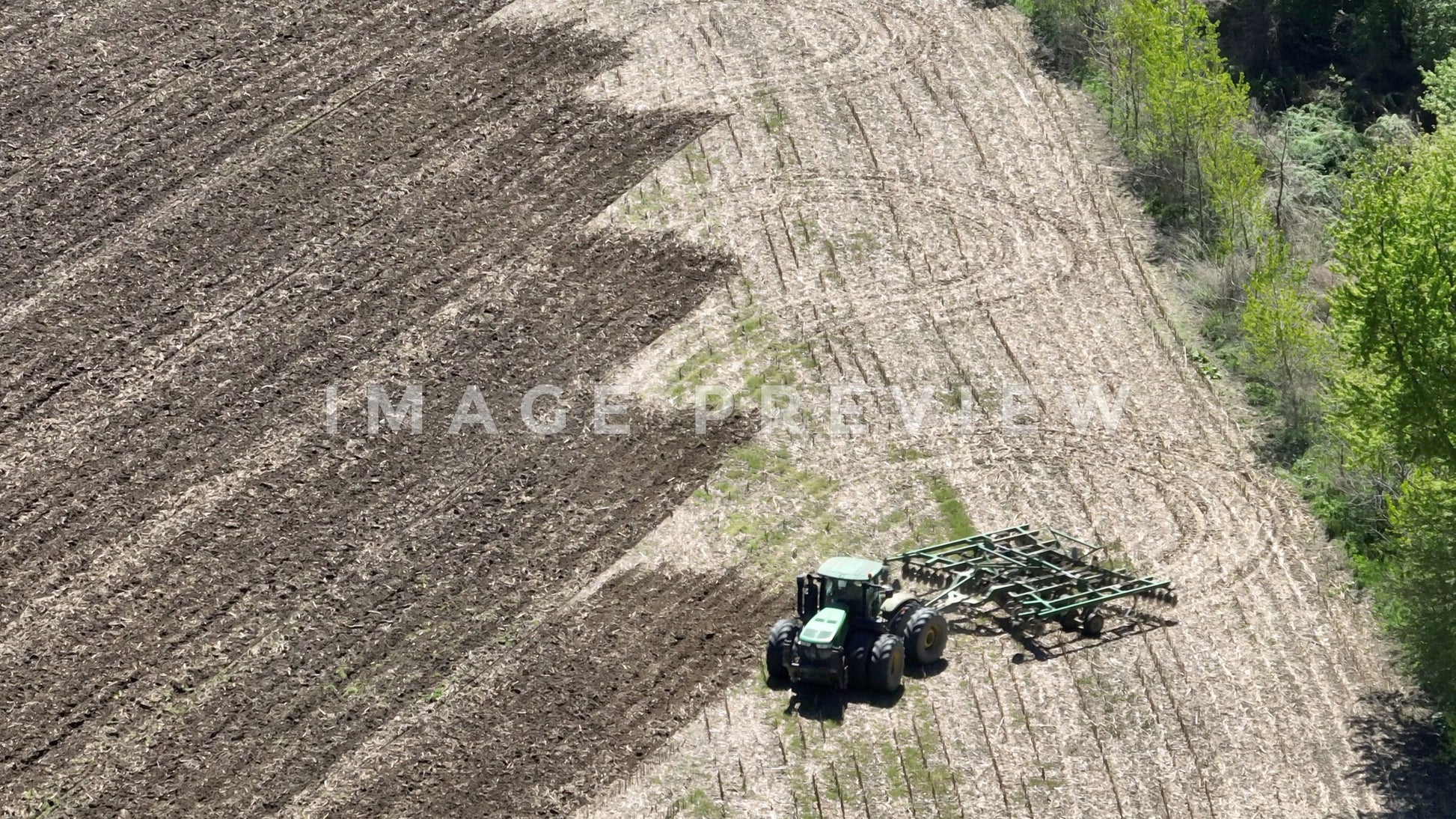 4k Still Frame - 7x zoom close up of farmer plowing cornfield in Springtime