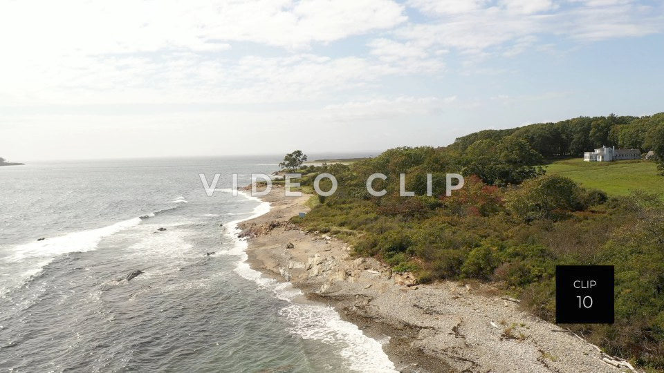 CLIP 8 - Maine Coast slow flight over waves breaking on rocky shore with view of houses