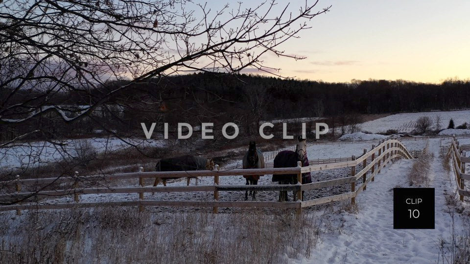 CLIP 6 - Horses in pasture on farm during Winter at sunset