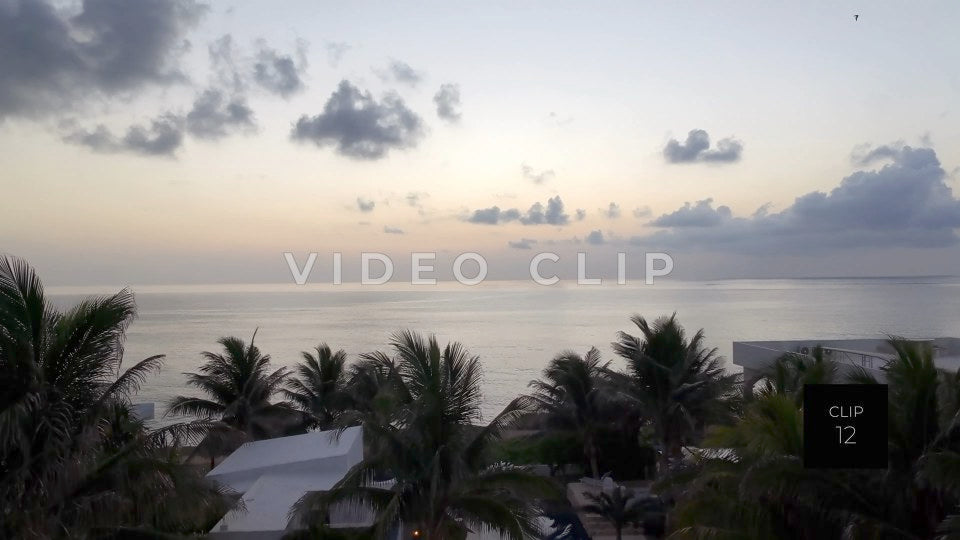 CLIP 15 - Isla Mujeras, Mexico low flight over rooftop past palms to sun rising