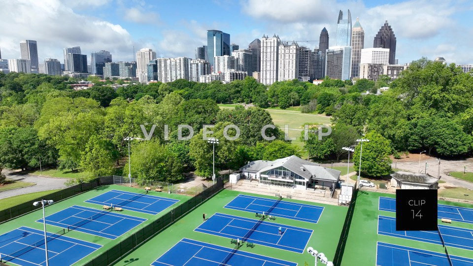 CLIP 2 - Atlanta, GA Aerial rising up over Tennis courts to city skyline from Piedmont Park