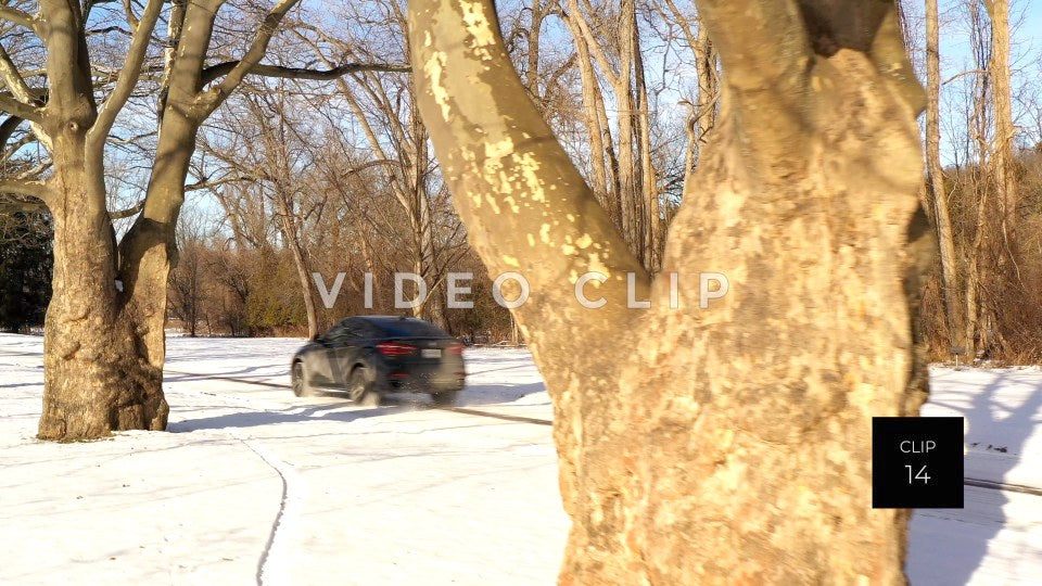 CLIP 14 - Car drives past tree orchard in snow at Winter Ellison Park, NY