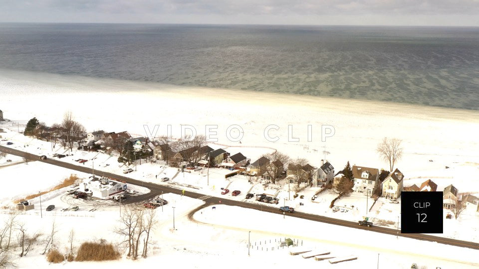 CLIP 5 - Winter Lake Ontario looking down on frozen shoreline beside road