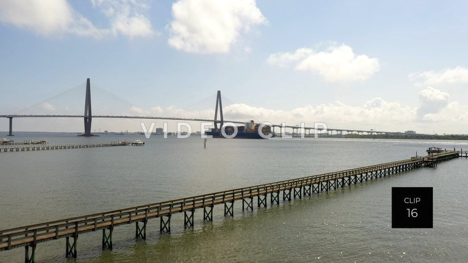 CLIP 16 - Charleston, SC flying over fishing docks to Arthur Ravenel Jr. Bridge