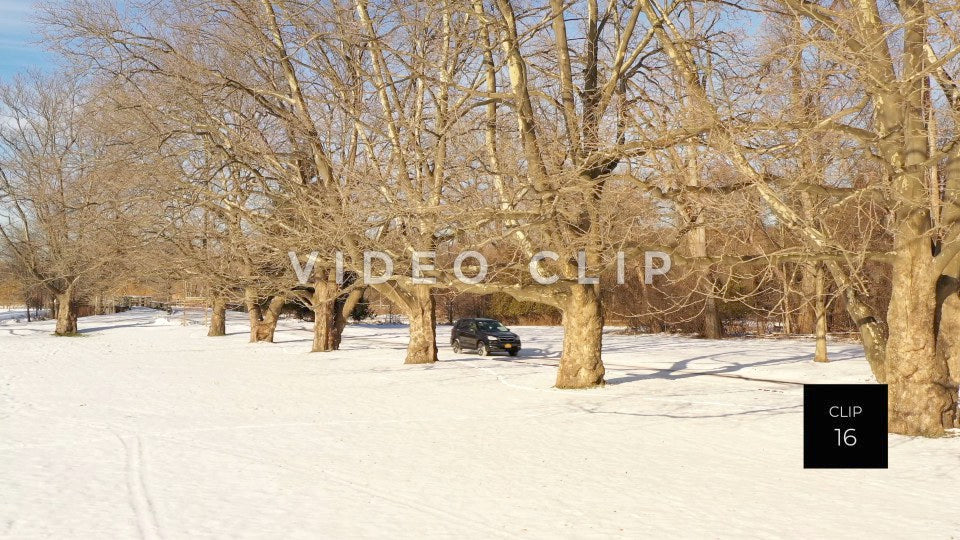 CLIP 14 - Car drives past tree orchard in snow at Winter Ellison Park, NY
