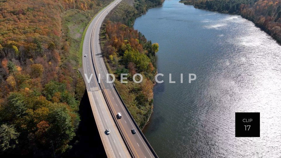 CLIP 16 - Tioga Dam and Reservoir, PA flying over bridge as cars drive over reservoir