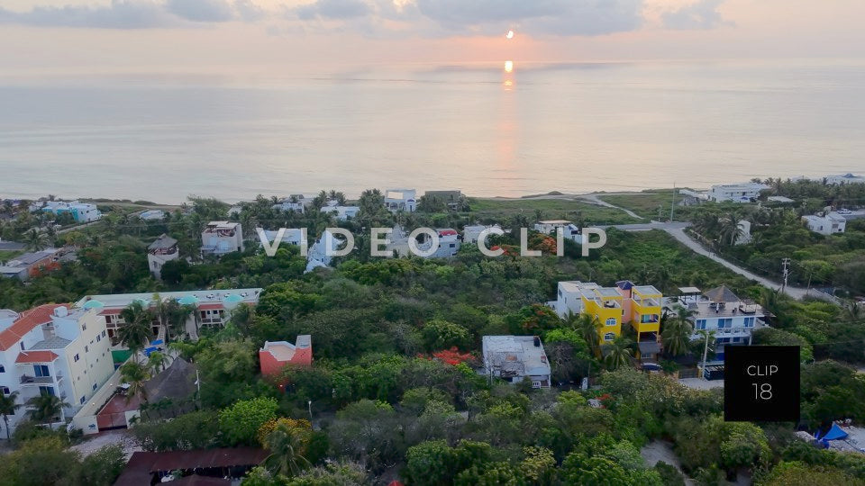 CLIP 15 - Isla Mujeras, Mexico low flight over rooftop past palms to sun rising