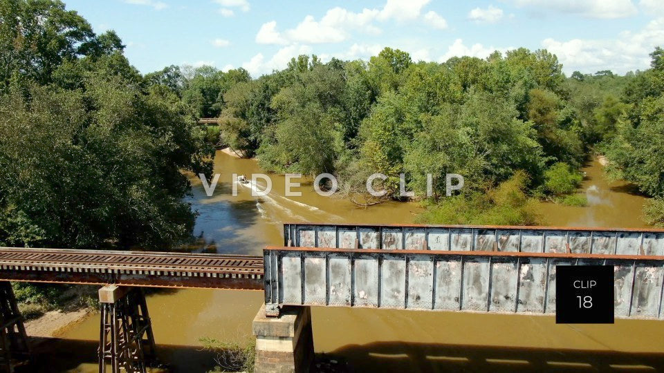 CLIP 18 - Montezuma, GA fisherman in boat motors past train bridge on Flint River