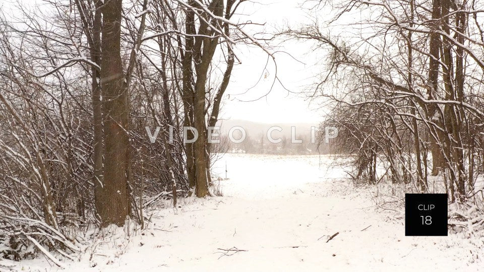 CLIP 18 - Fields and trees with snow falling in Wintertime