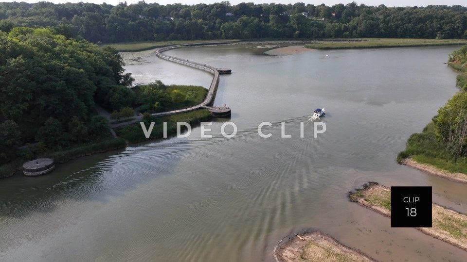 CLIP 7 - Rochester, NY Genesee Riverway Trail boardwalk in afternoon sunlight with boat passing by