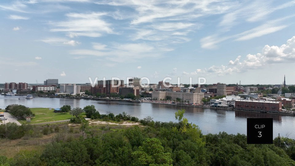 CLIP 3 - Wilmington, NC city skyline under blue sky and clouds beside Cape Fear River