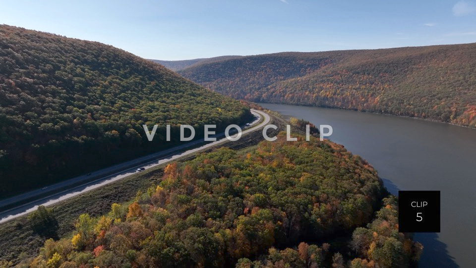 CLIP 7 - Tioga Dam and Reservoir, PA following cars on highway around mountainside