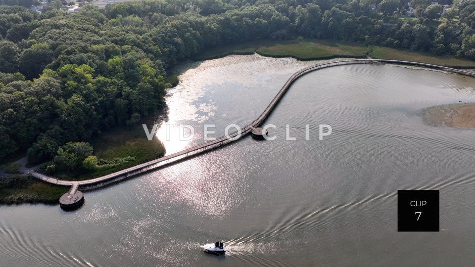 CLIP 7 - Rochester, NY Genesee Riverway Trail boardwalk in afternoon sunlight with boat passing by