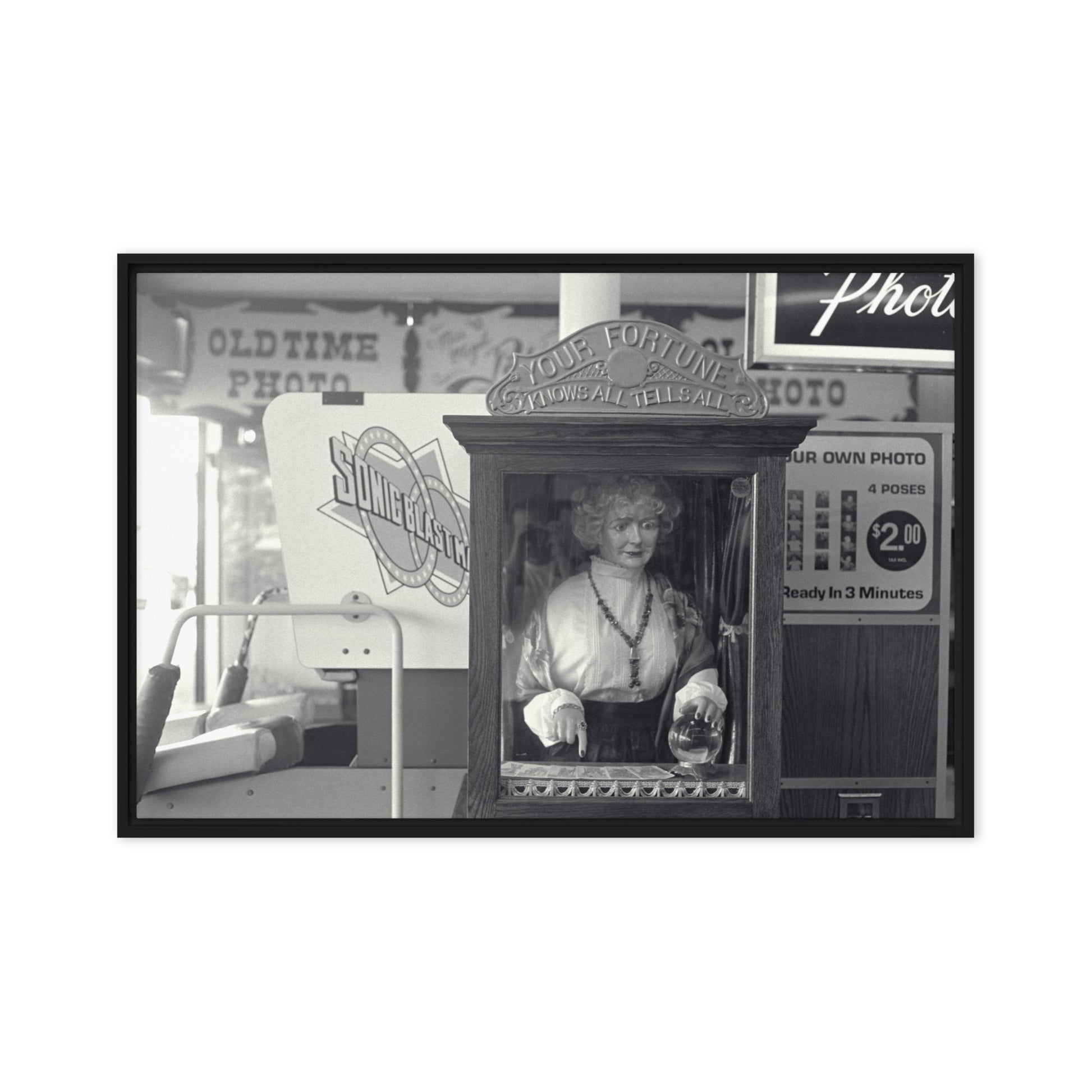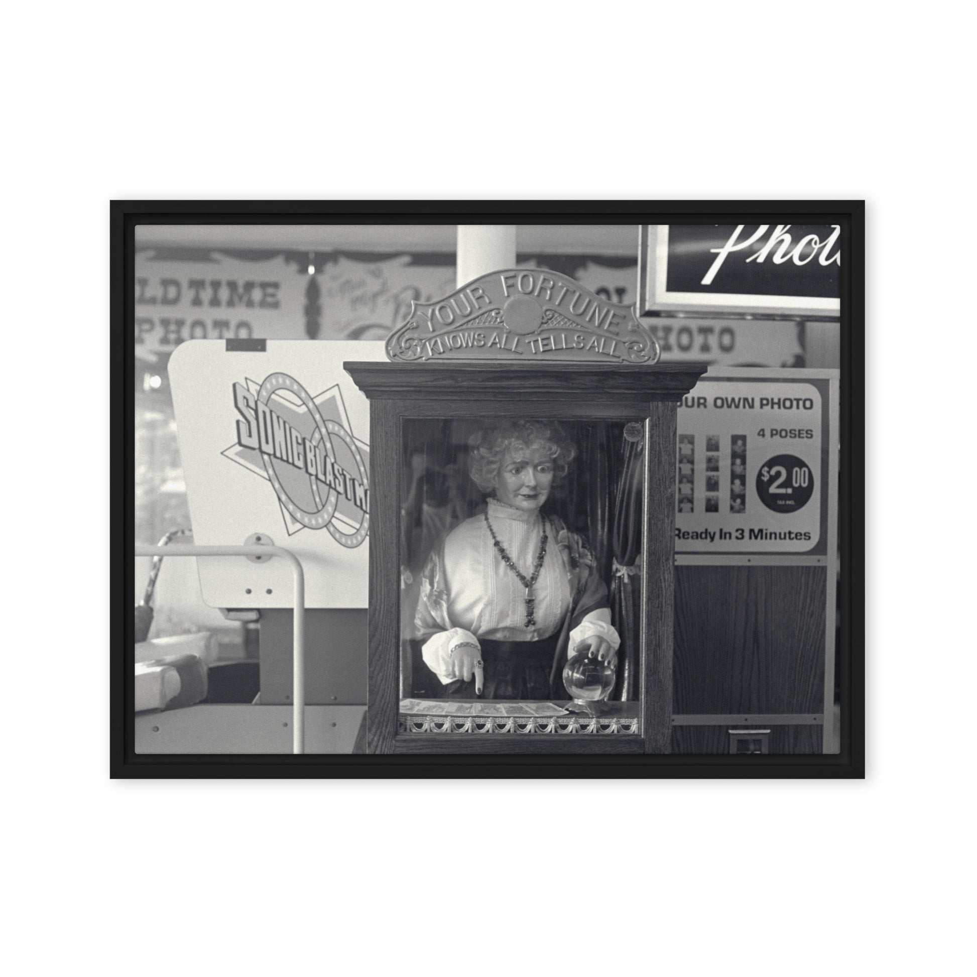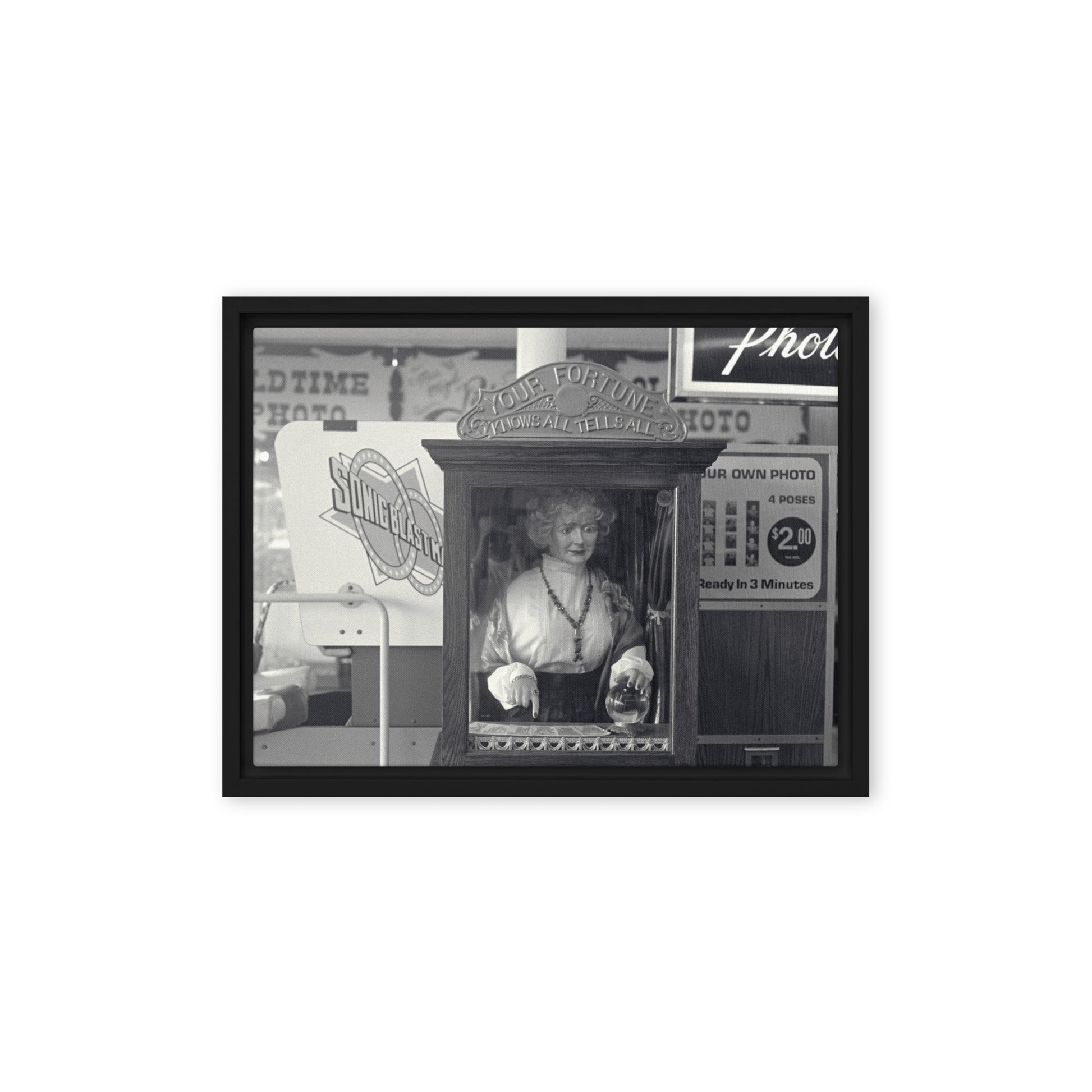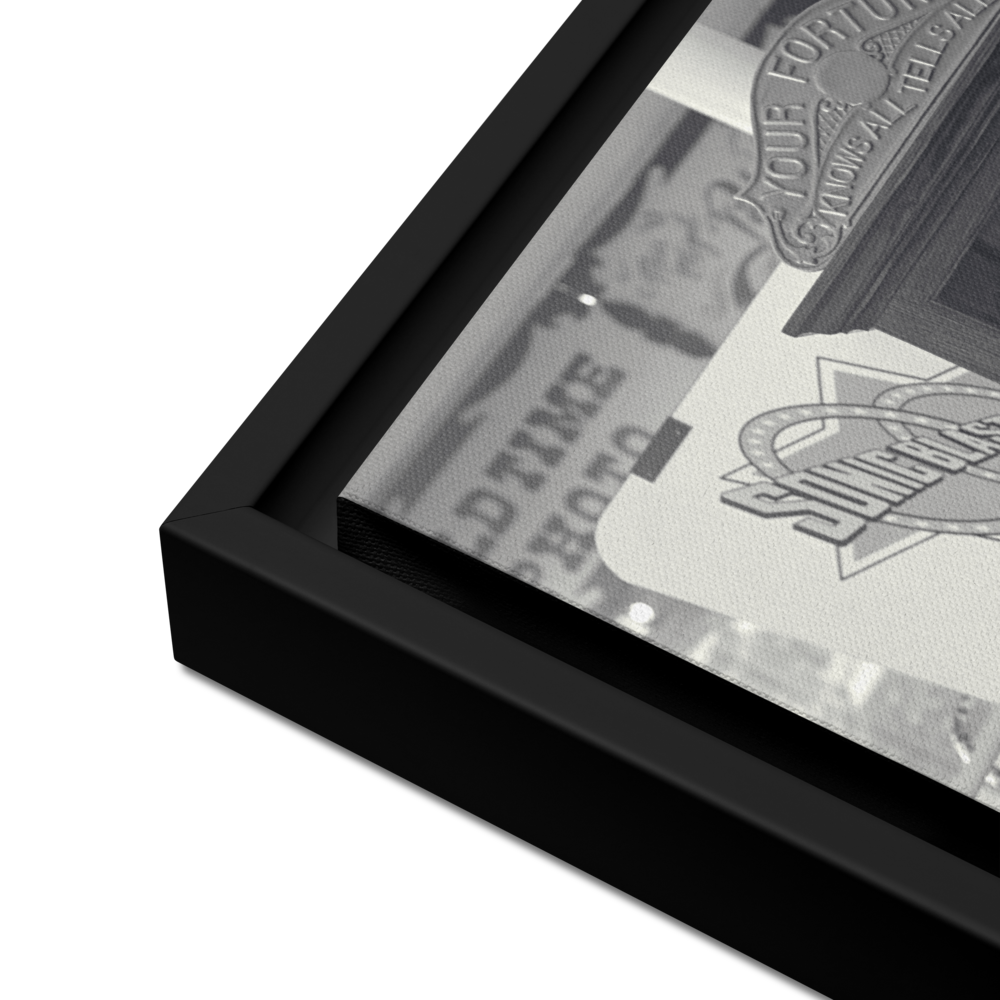 You'll receive a gallery-quality black and white 35mm photograph printed on canvas, stretched and mounted in a sleek black frame, creating a striking floating effect.
