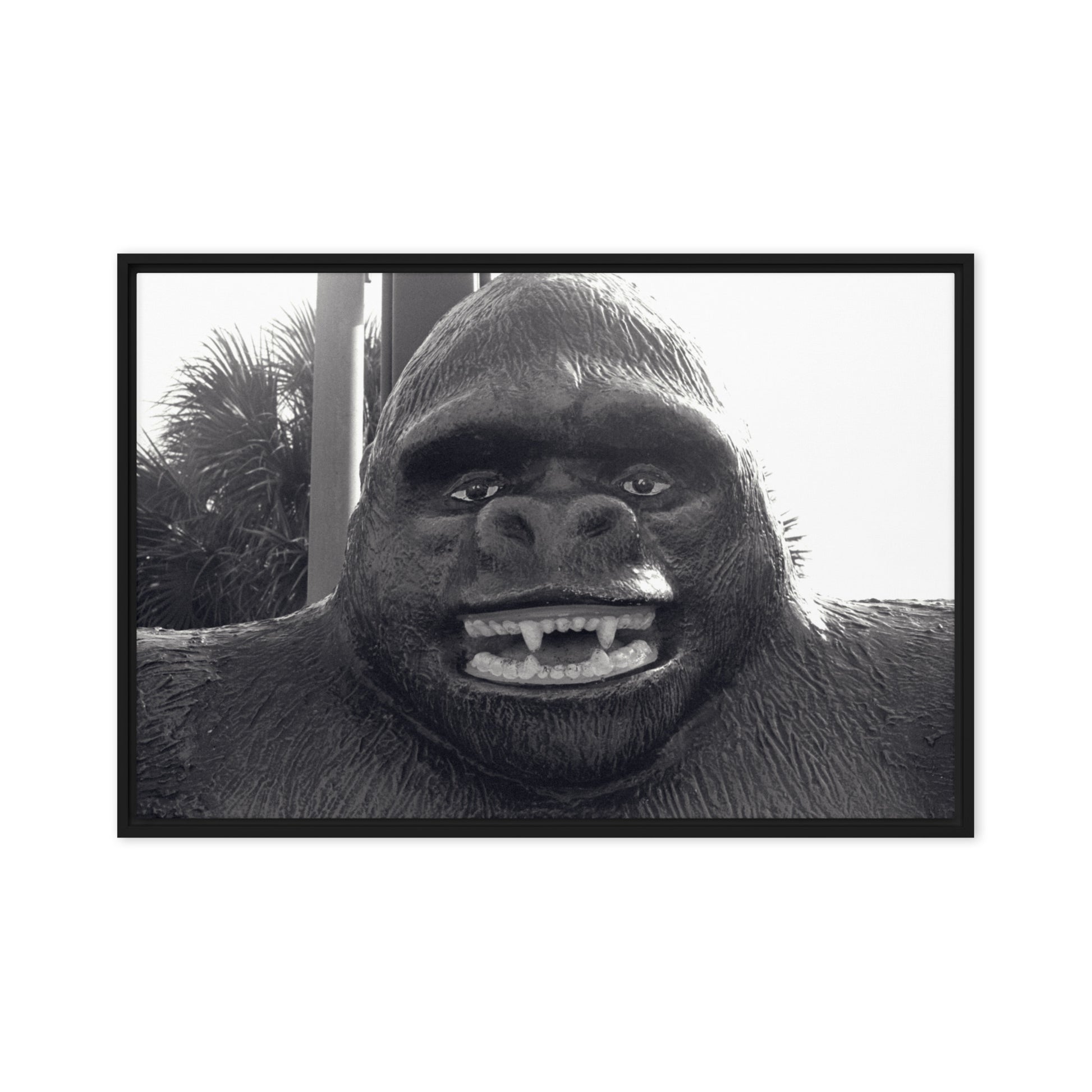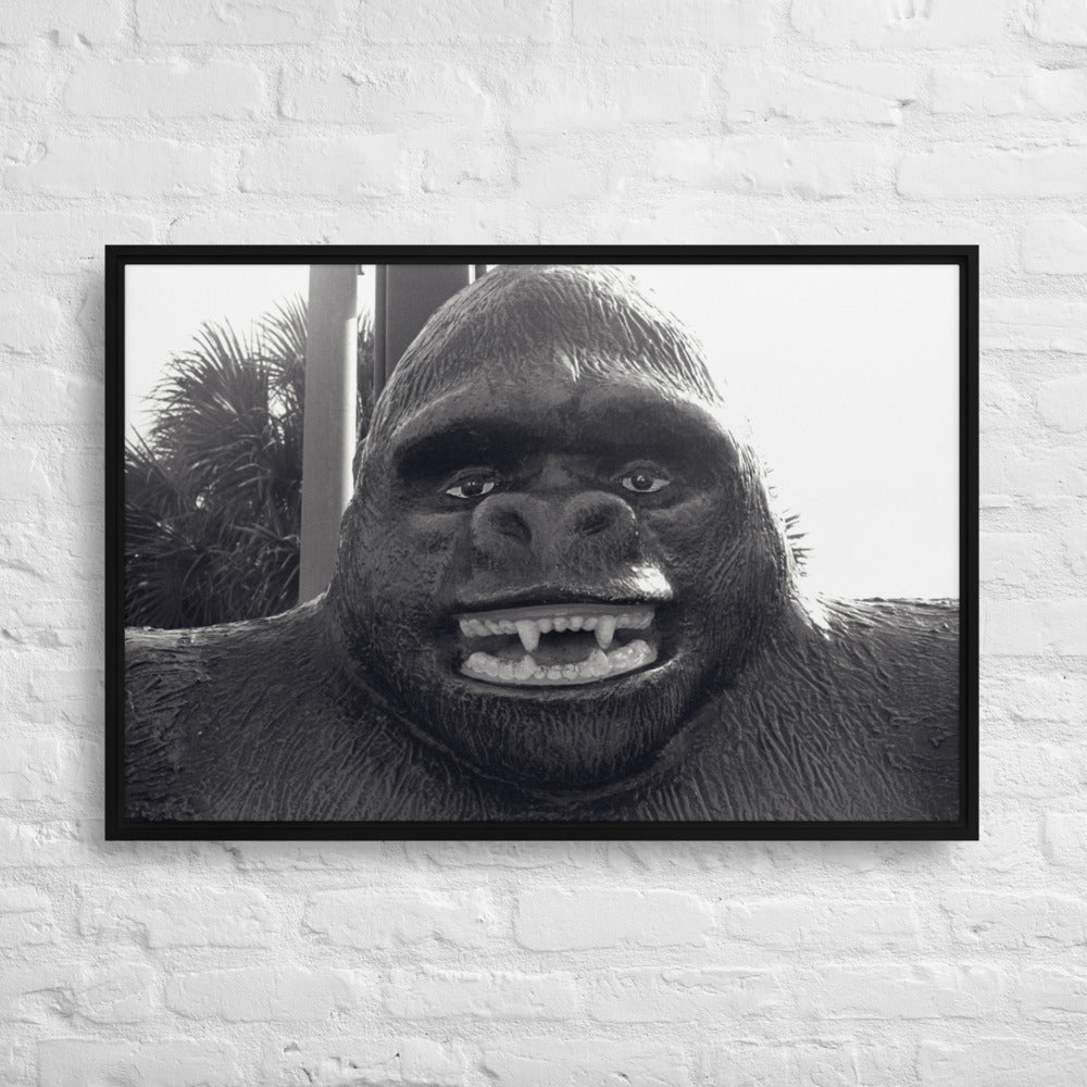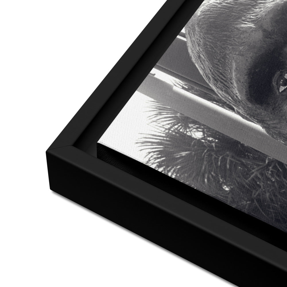 You'll receive a gallery-quality black and white 35mm photograph printed on canvas, stretched and mounted in a sleek black frame, creating a striking floating effect.