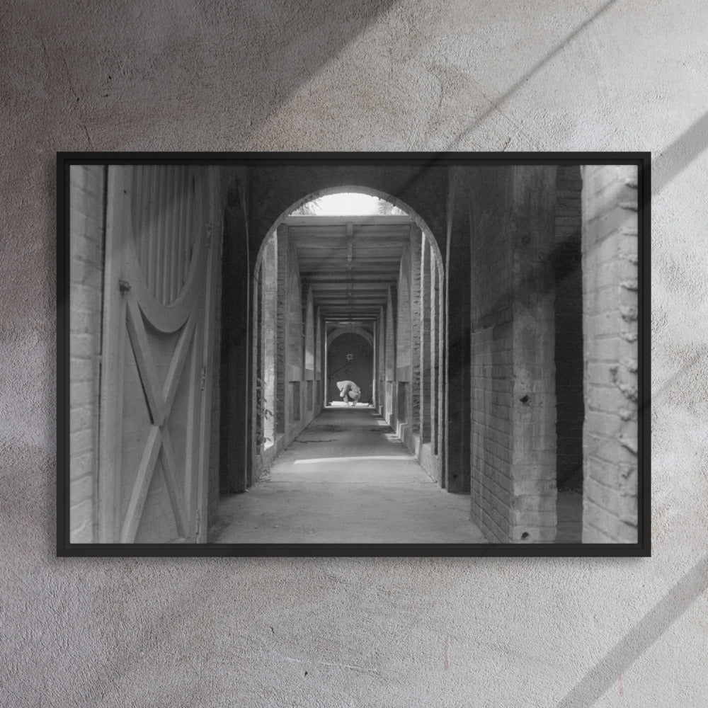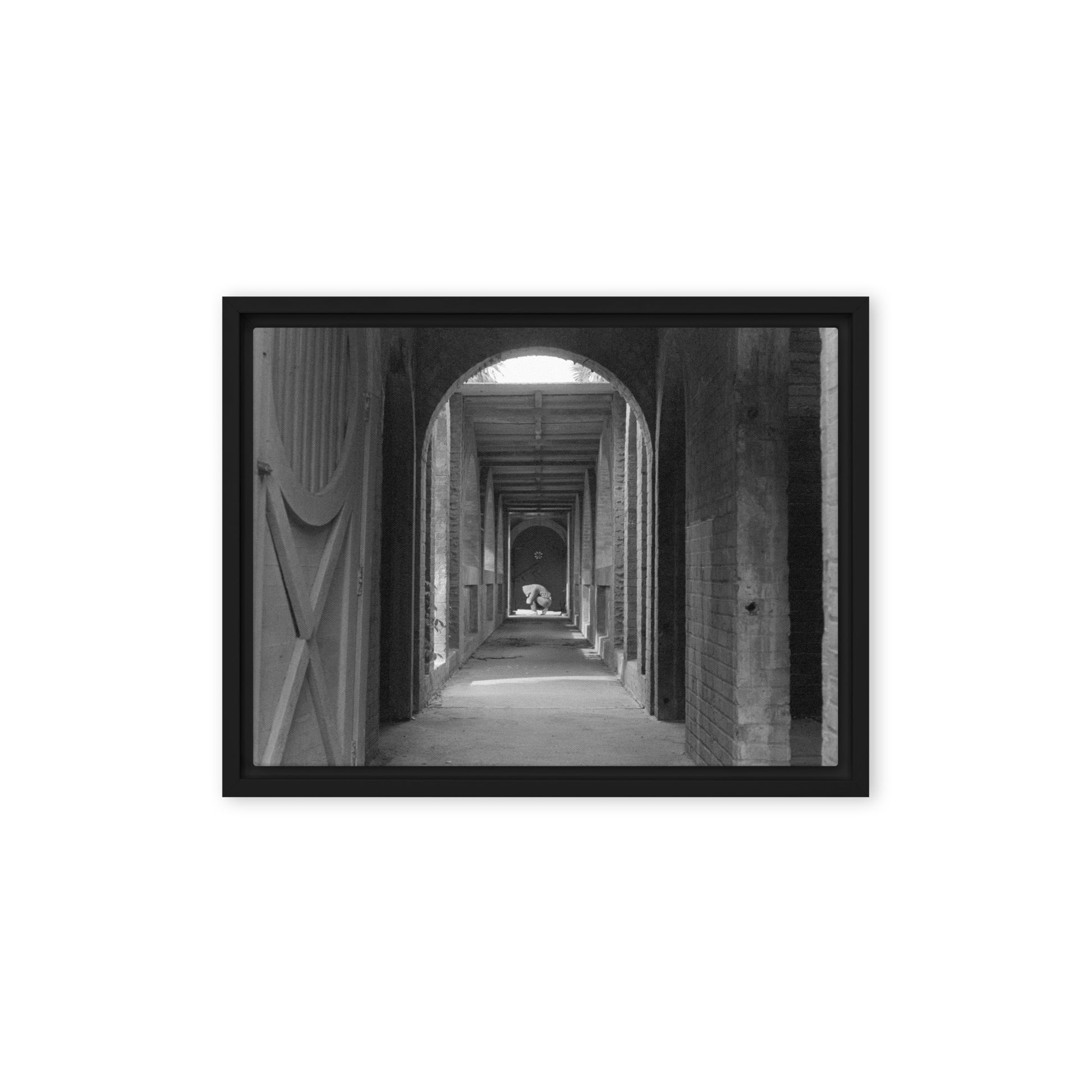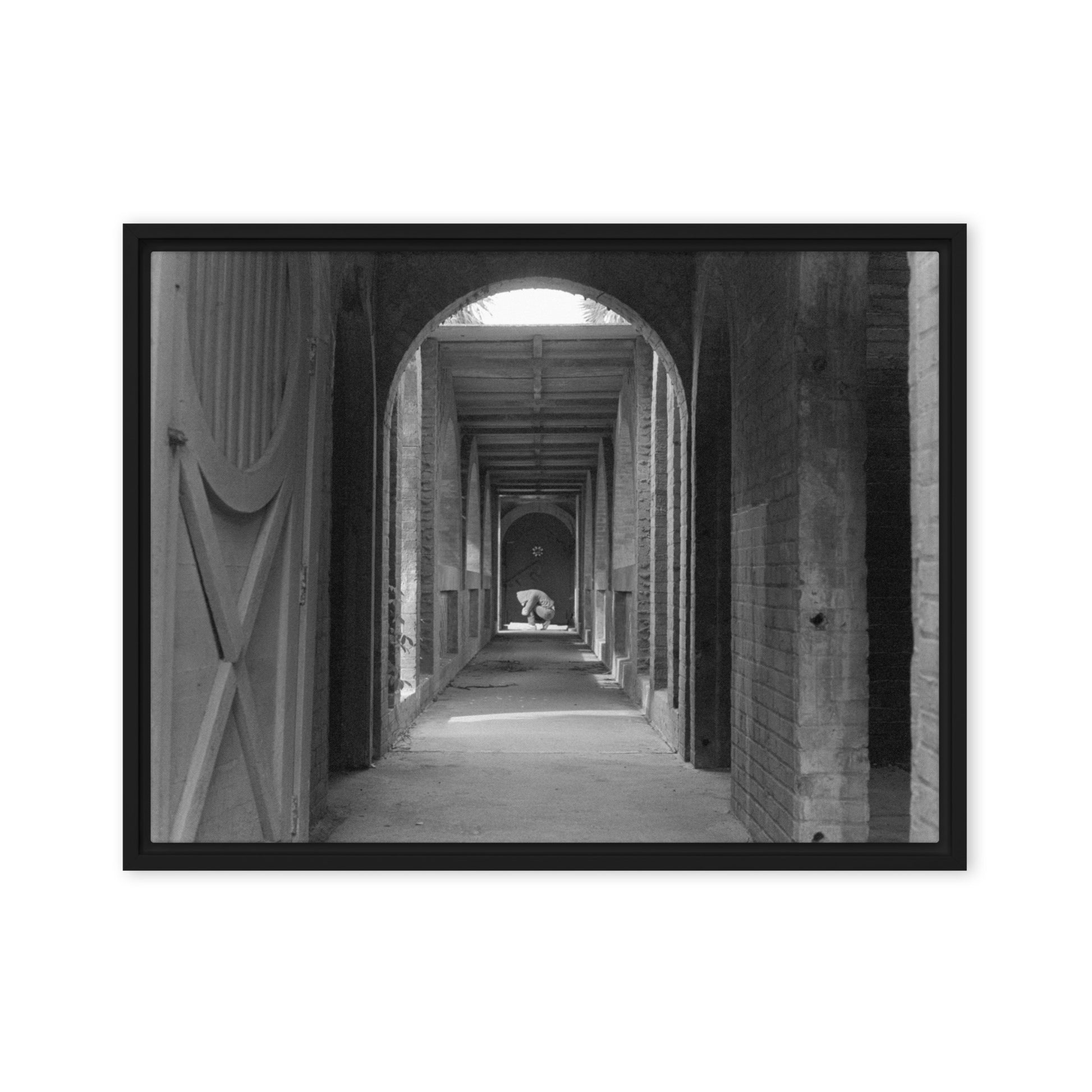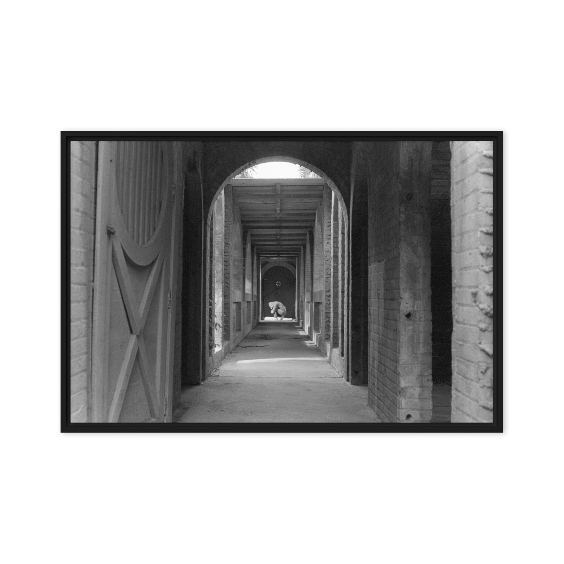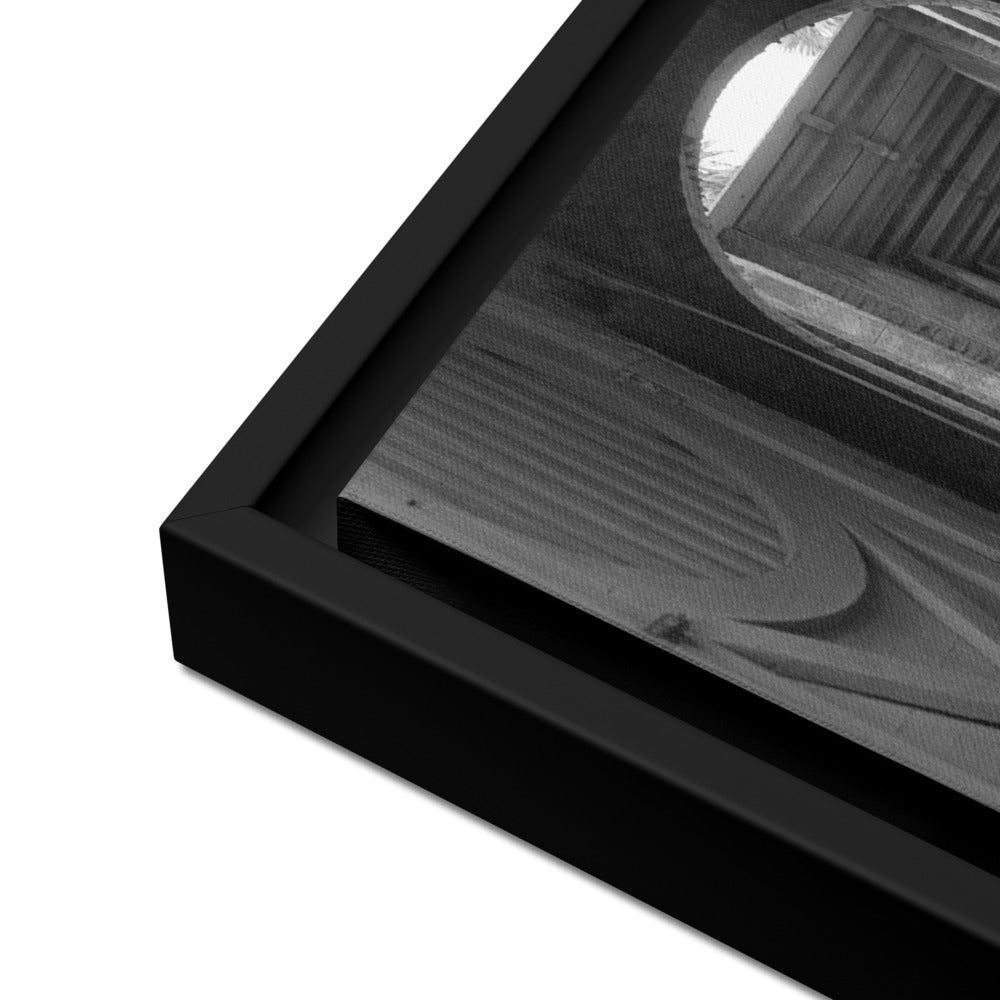 You'll receive a gallery-quality black and white 35mm photograph printed on canvas, stretched and mounted in a sleek black frame, creating a striking floating effect.
