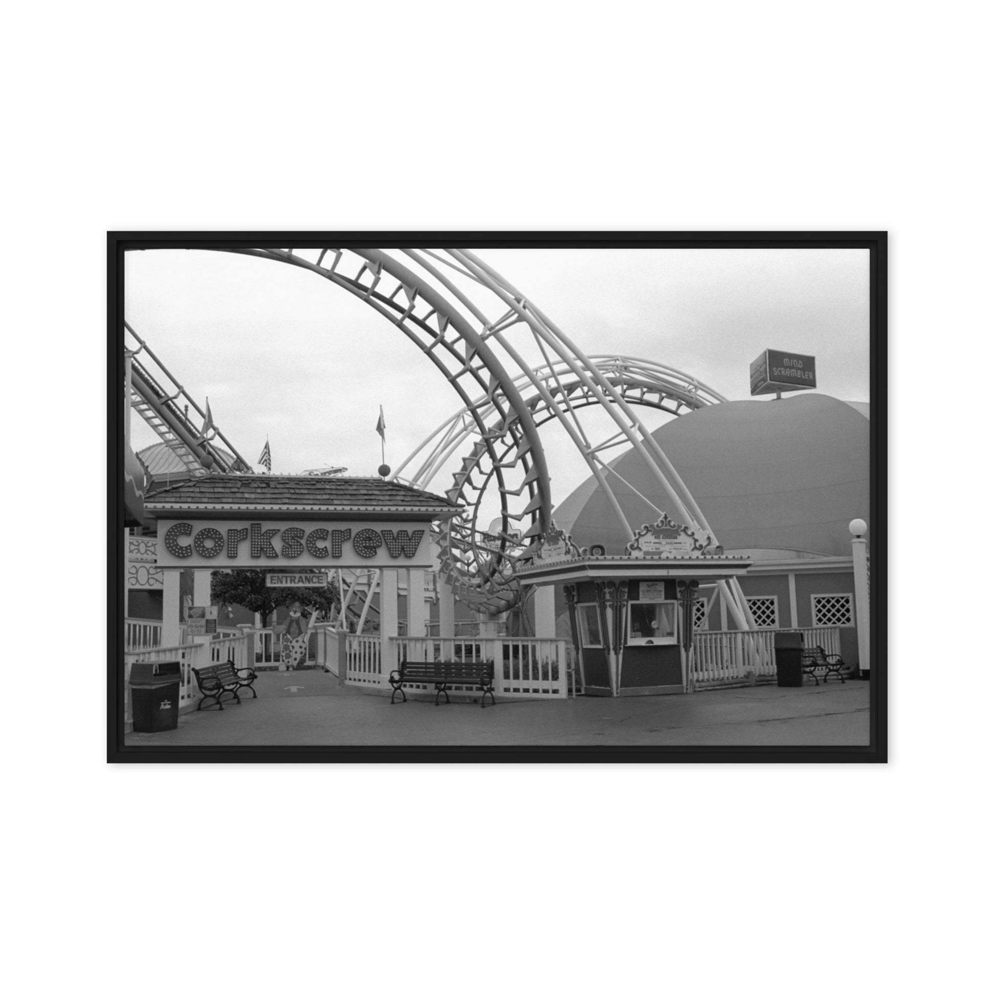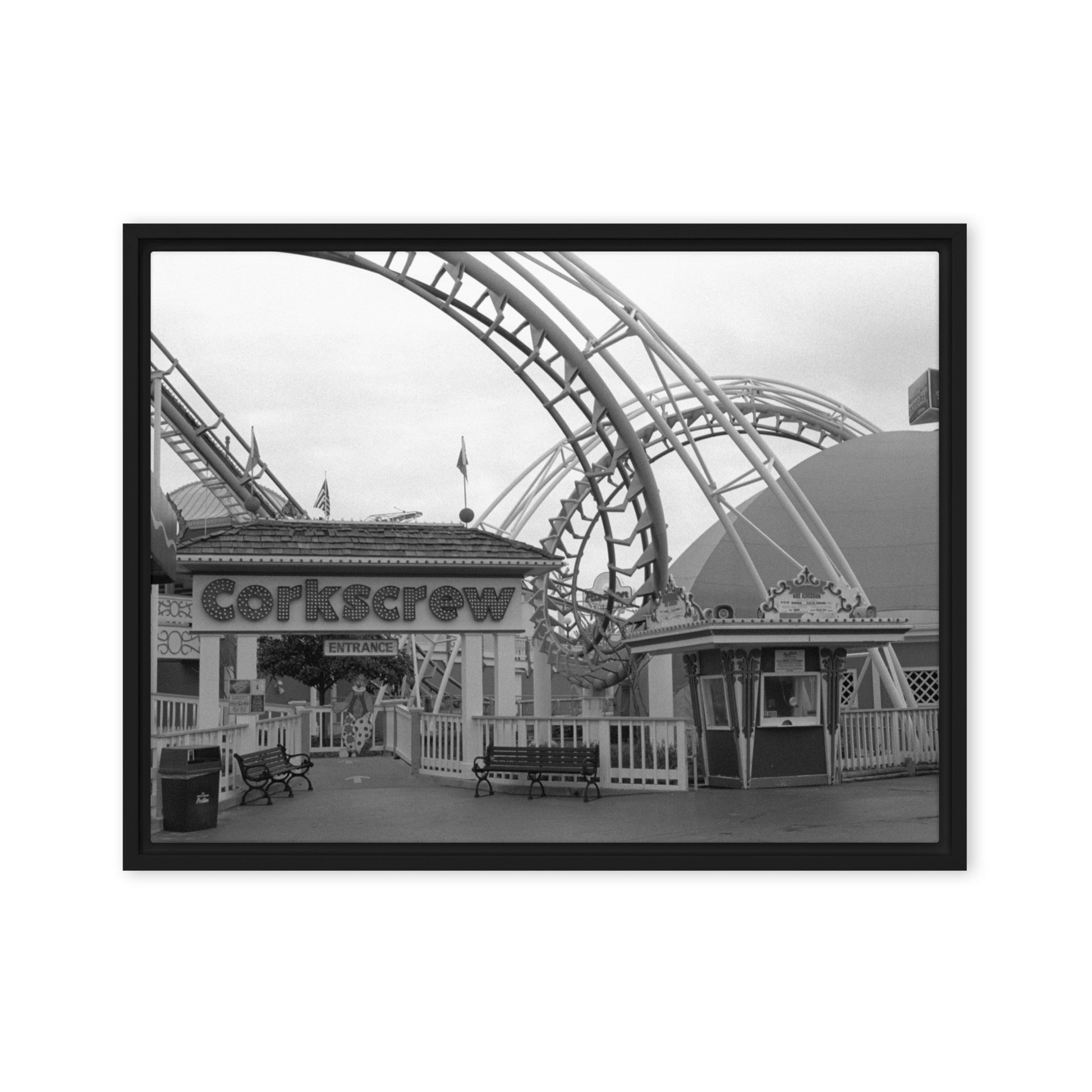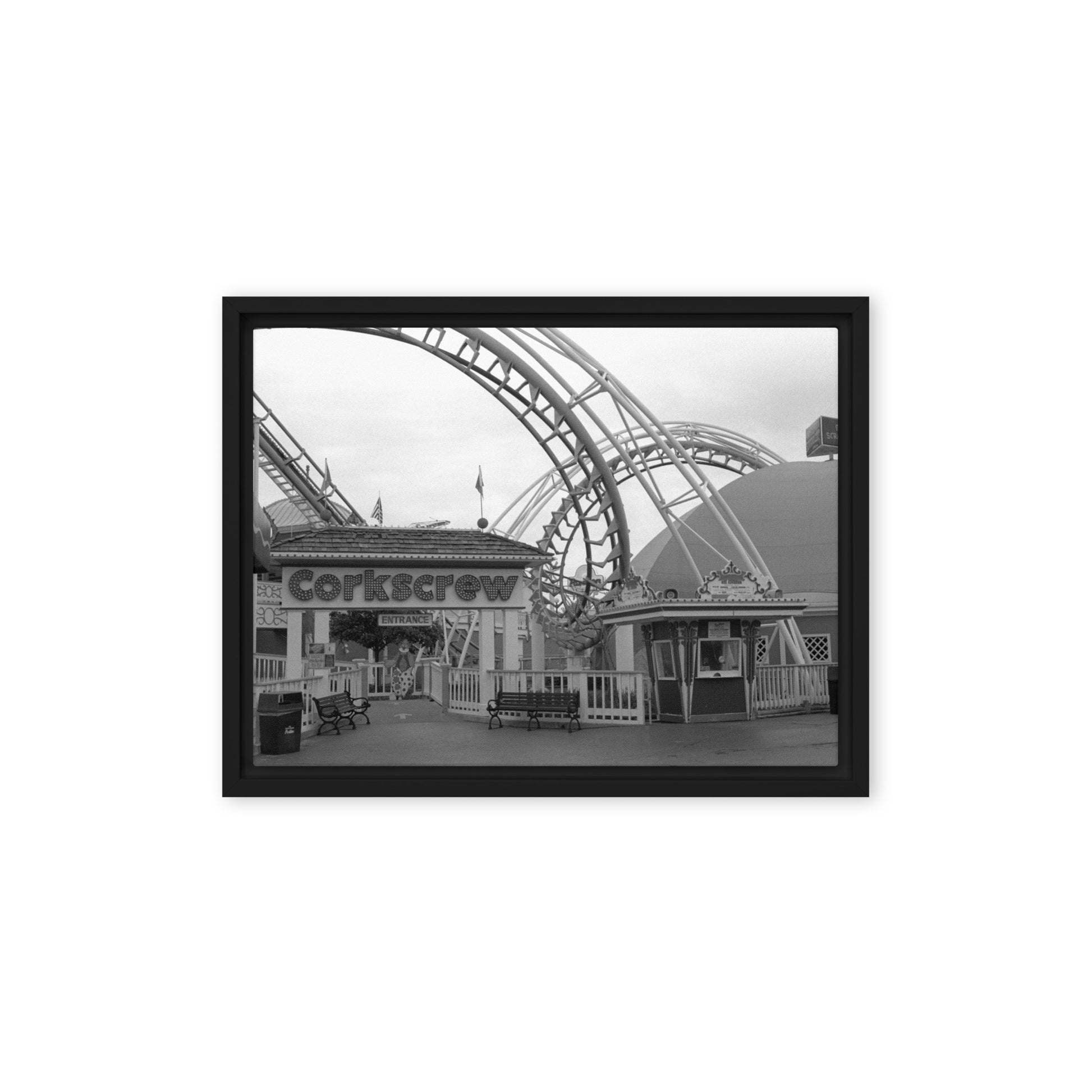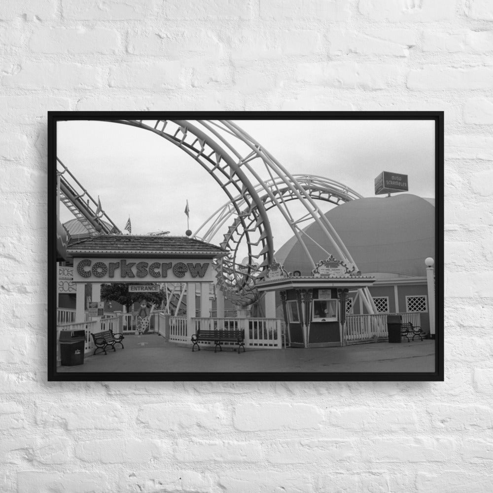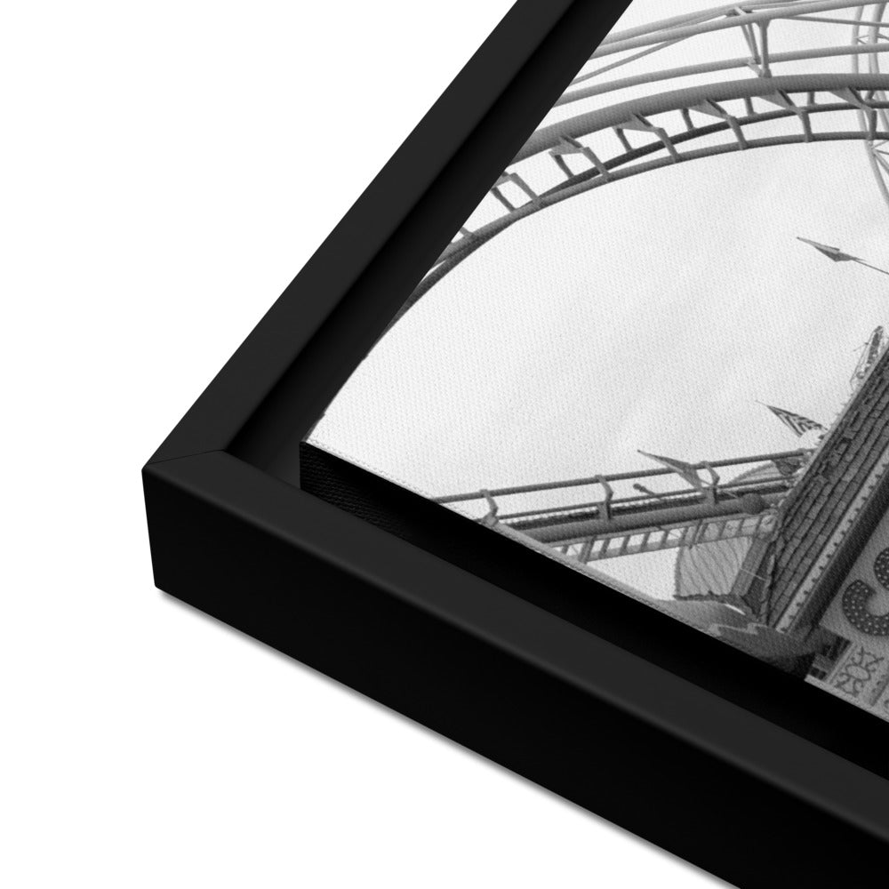 You'll receive a gallery-quality black and white 35mm photograph printed on canvas, stretched and mounted in a sleek black frame, creating a striking floating effect.
