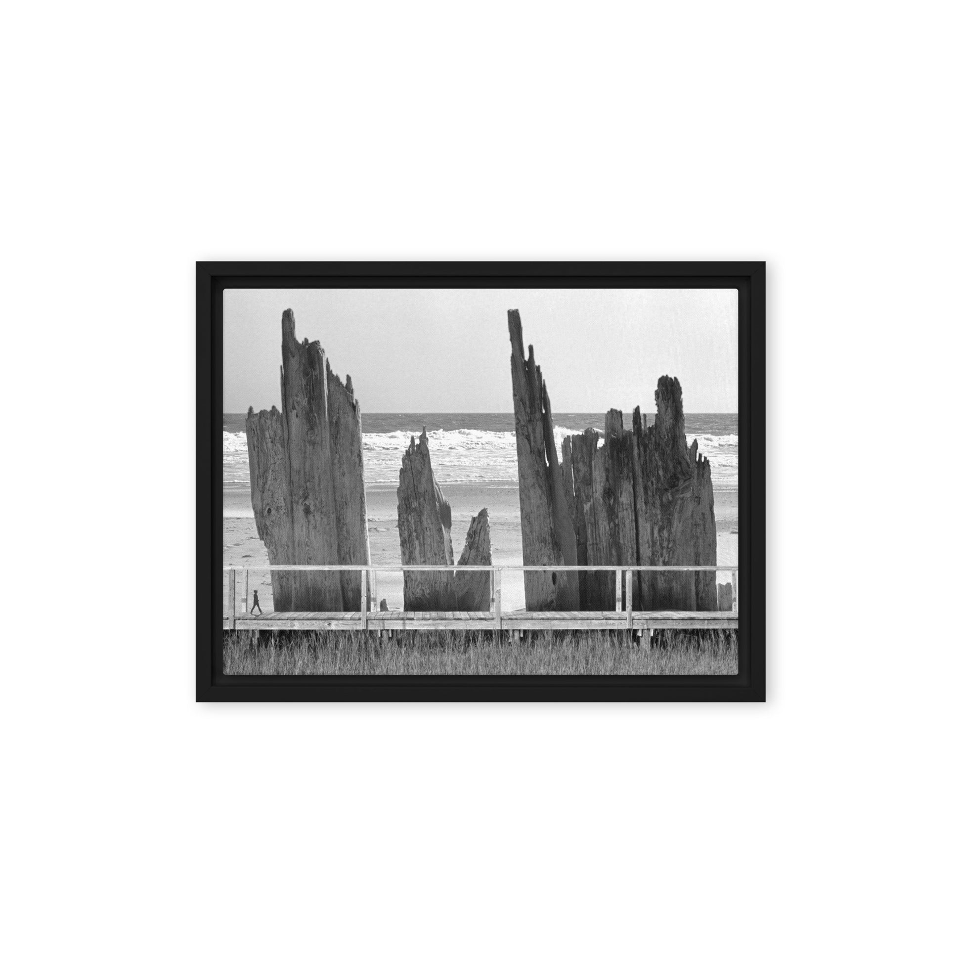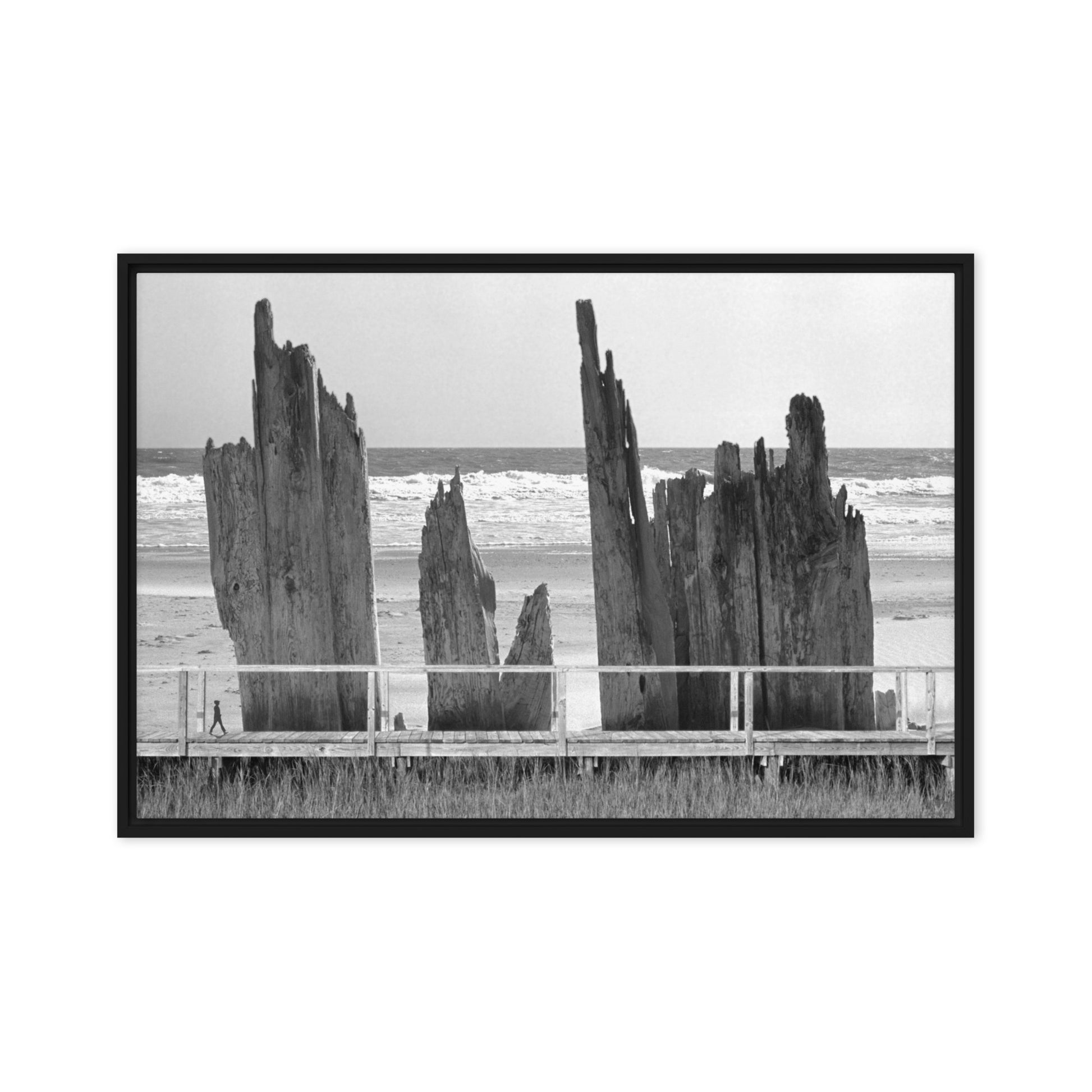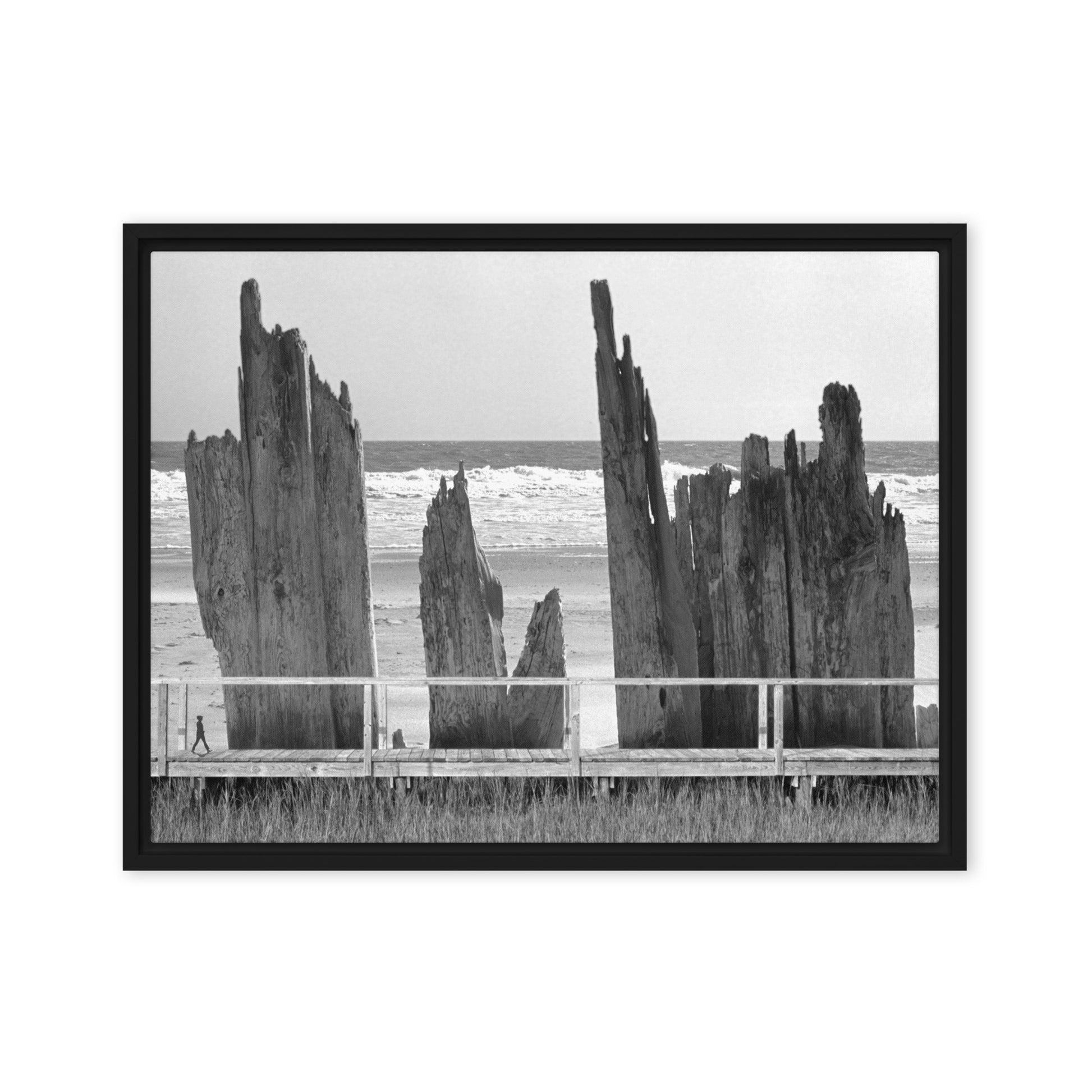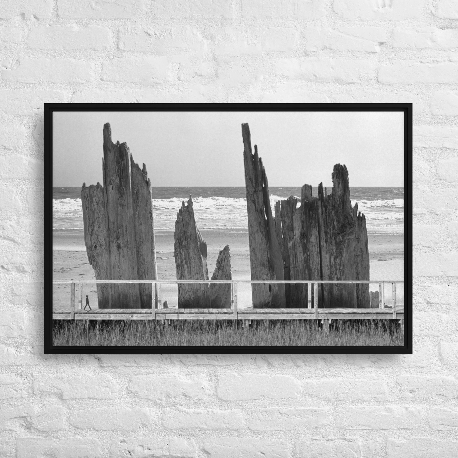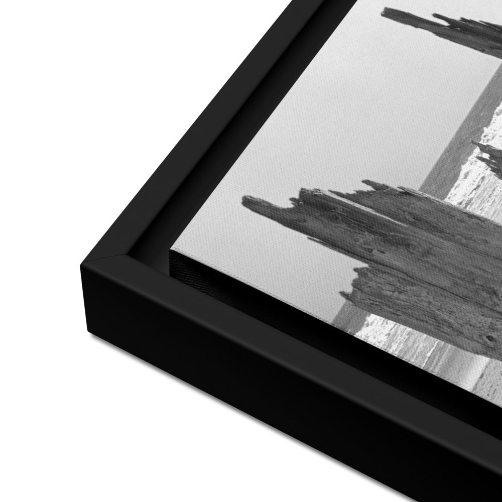 You'll receive a gallery-quality black and white 35mm photograph printed on canvas, stretched and mounted in a sleek black frame, creating a striking floating effect.