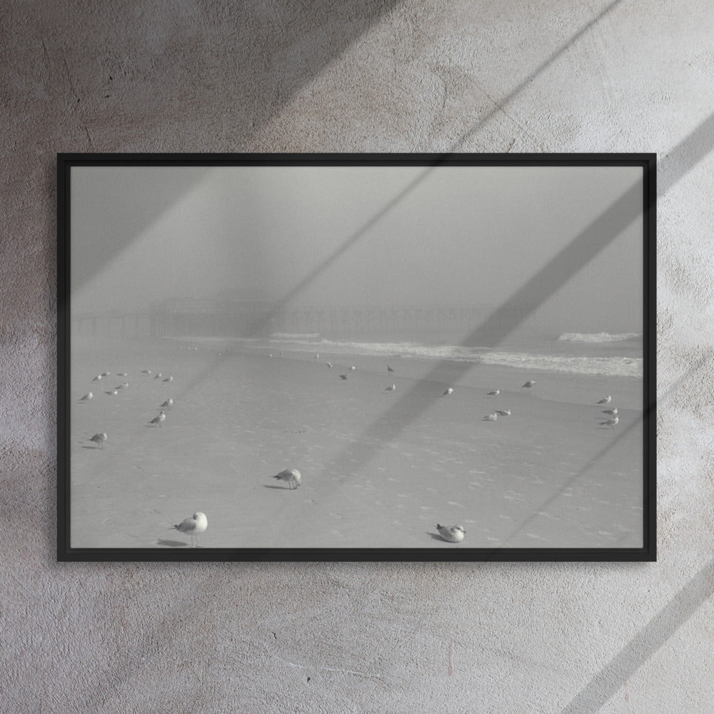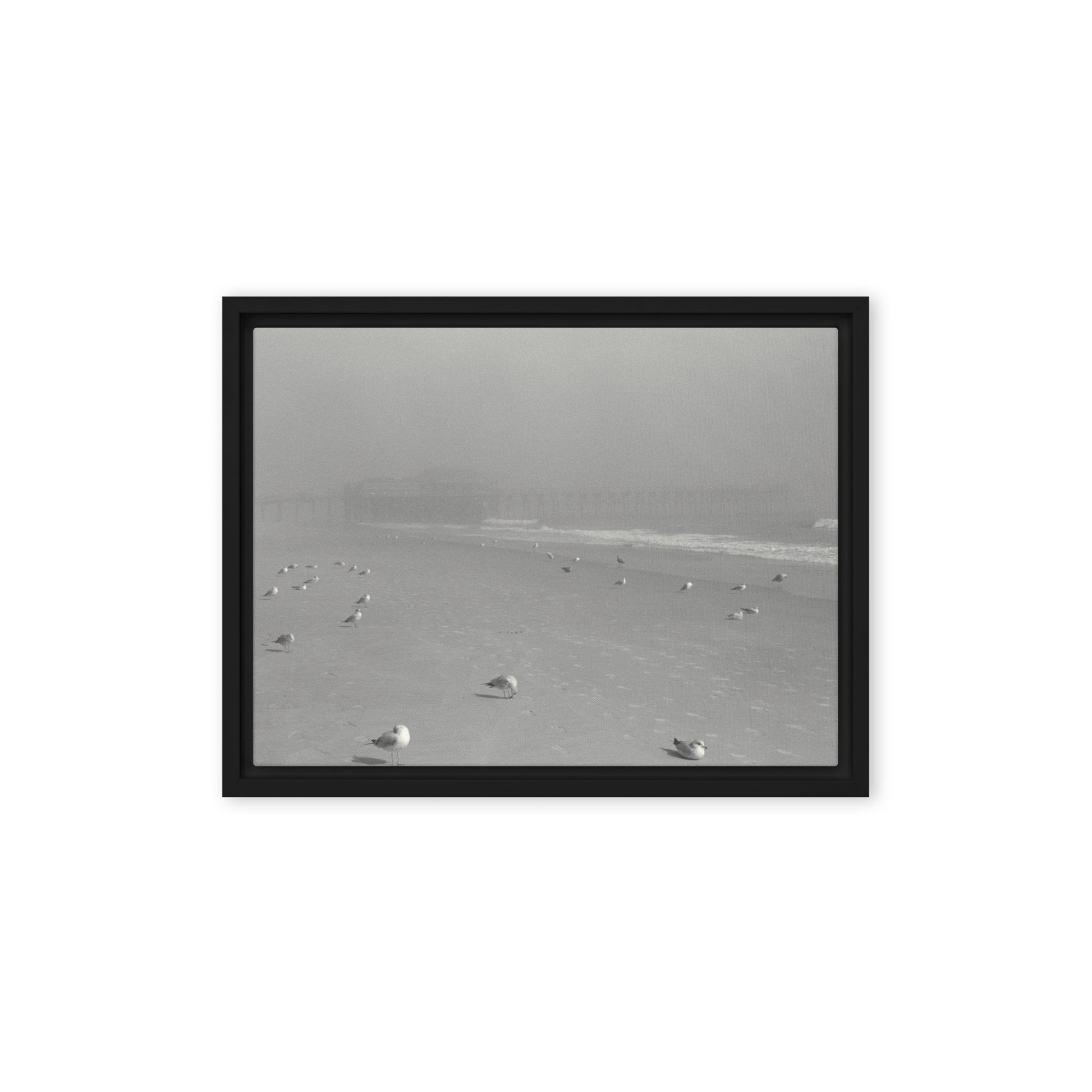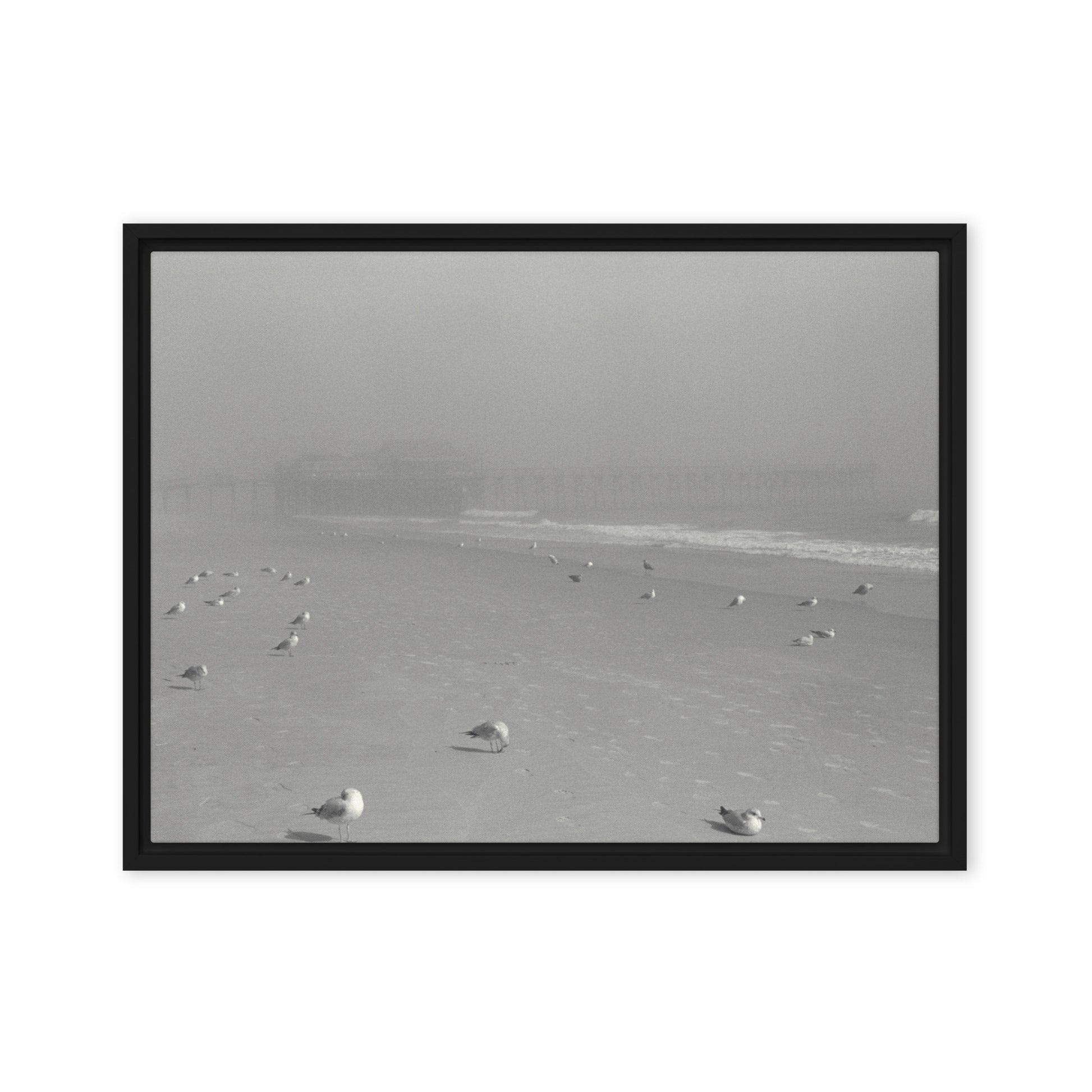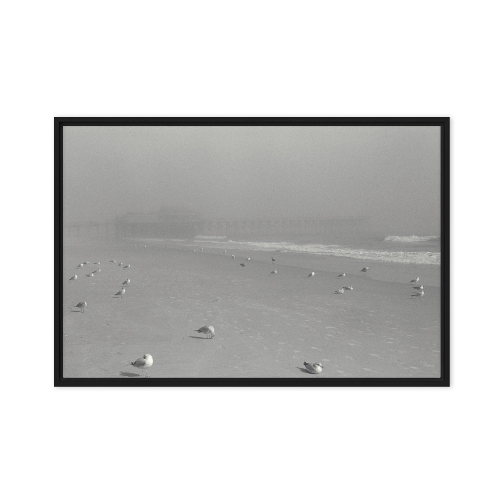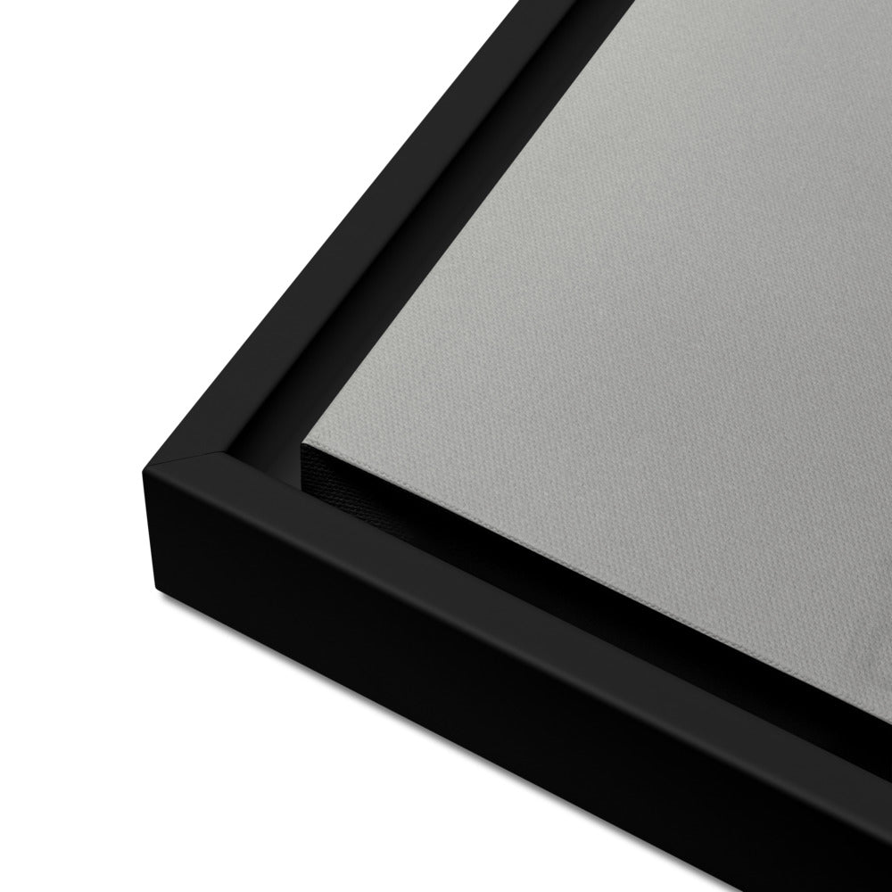 You'll receive a gallery-quality black and white 35mm photograph printed on canvas, stretched and mounted in a sleek black frame, creating a striking floating effect.