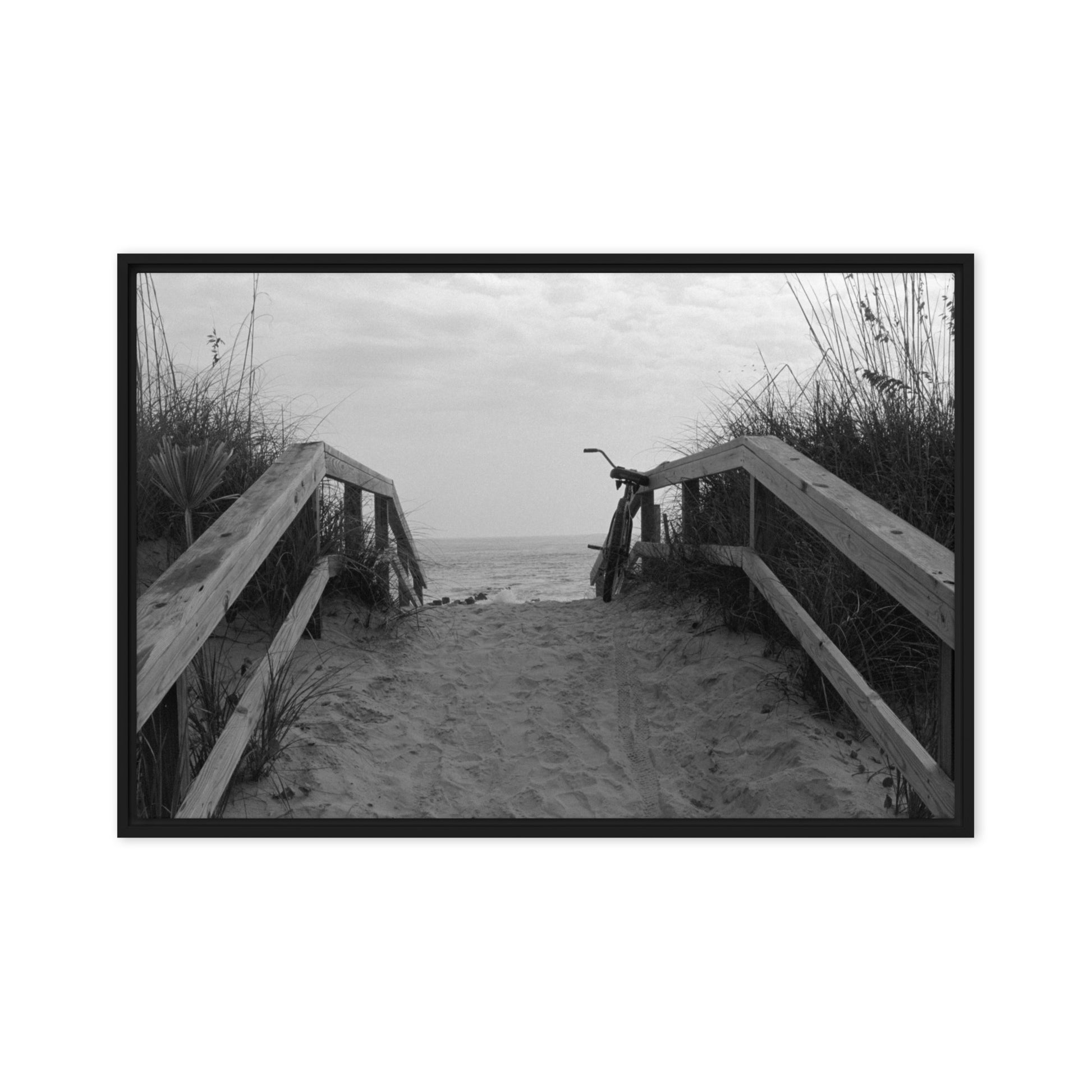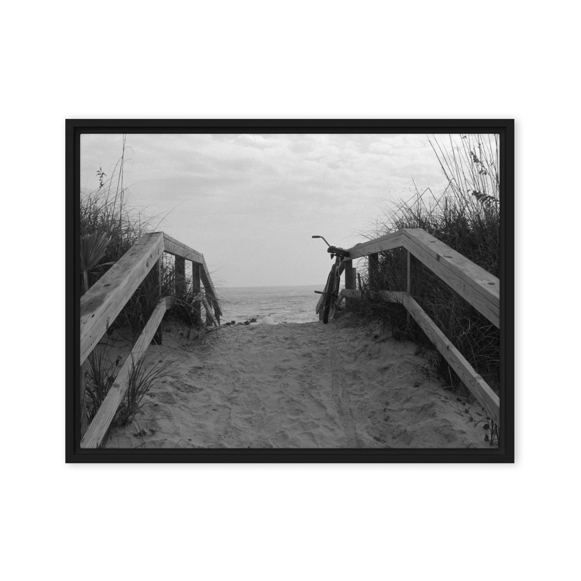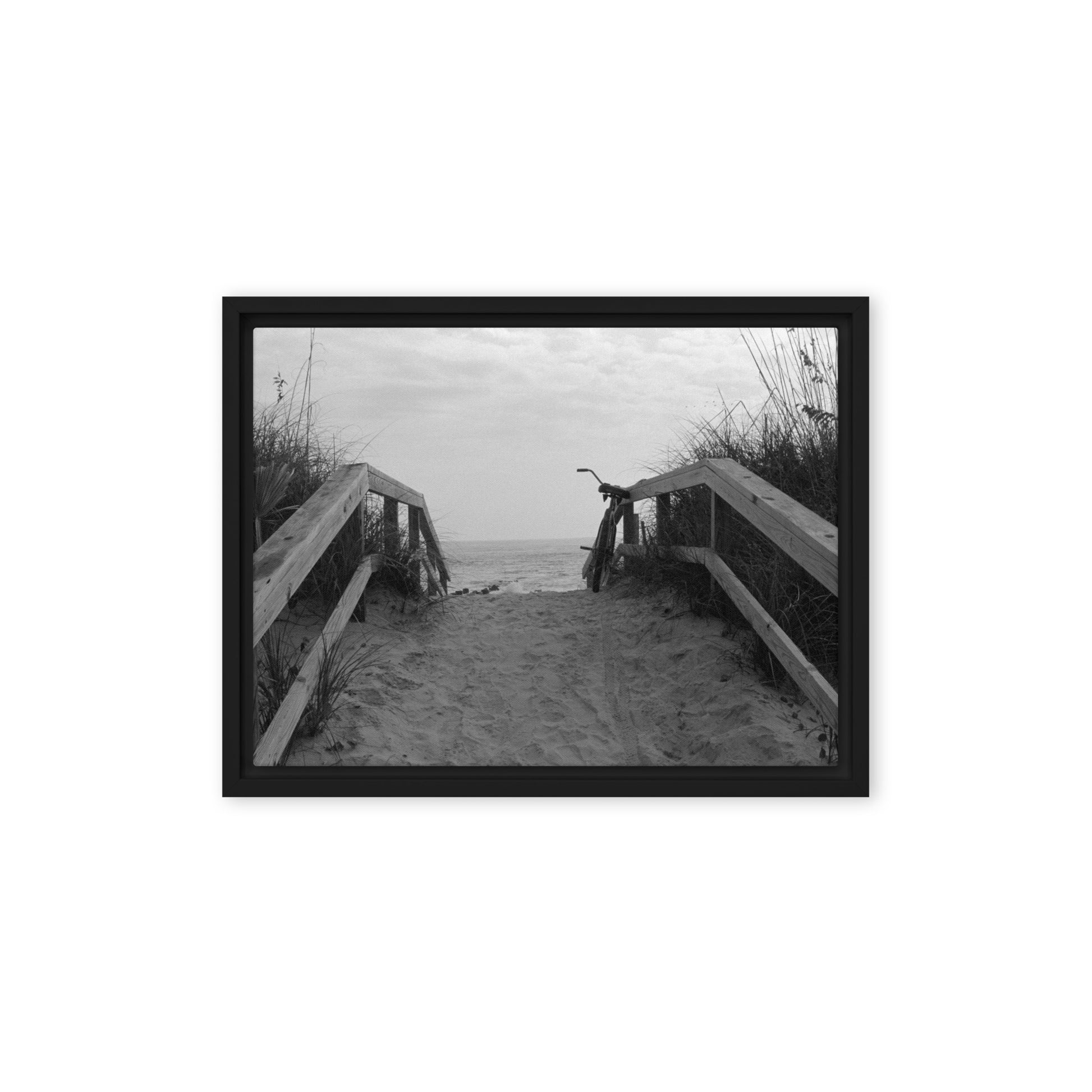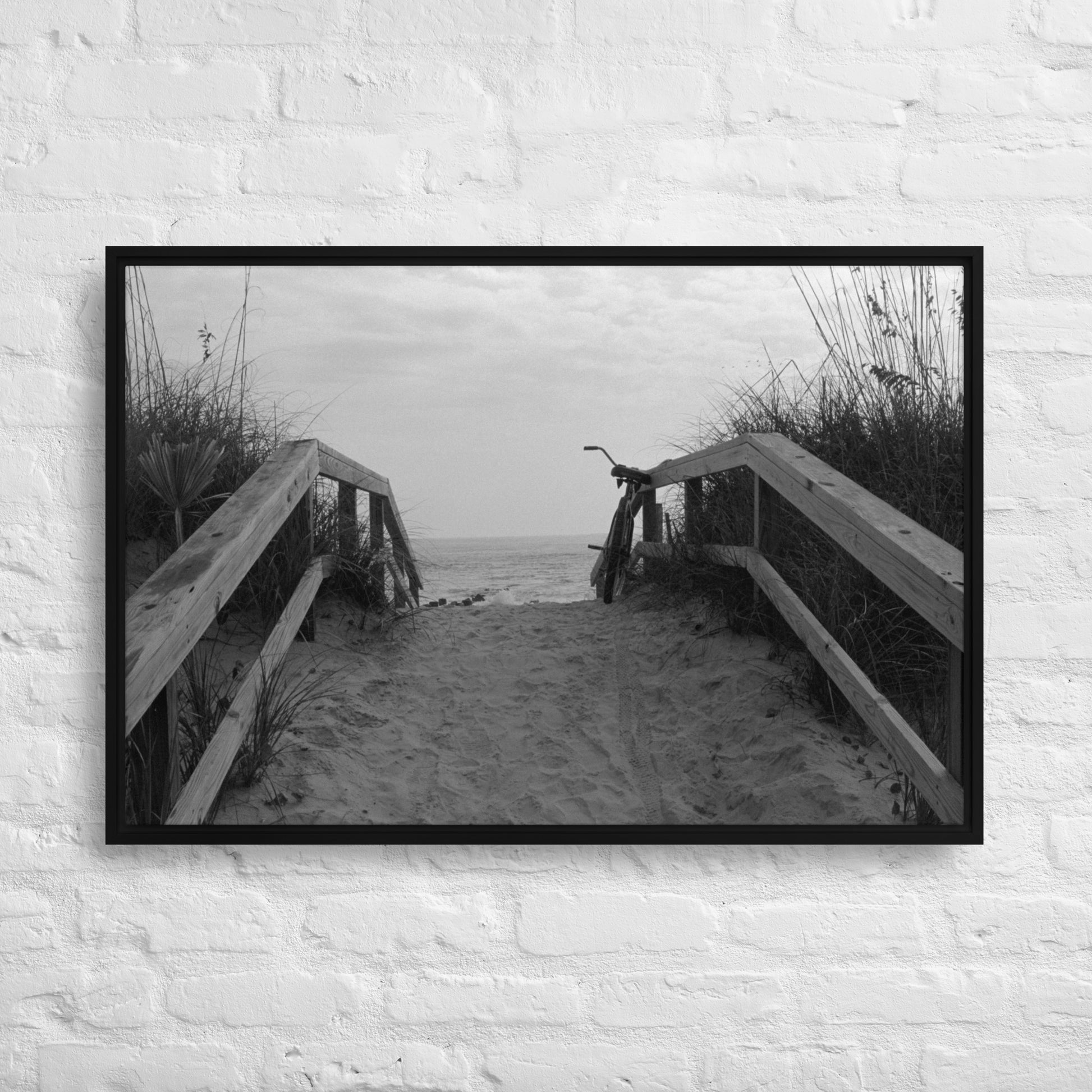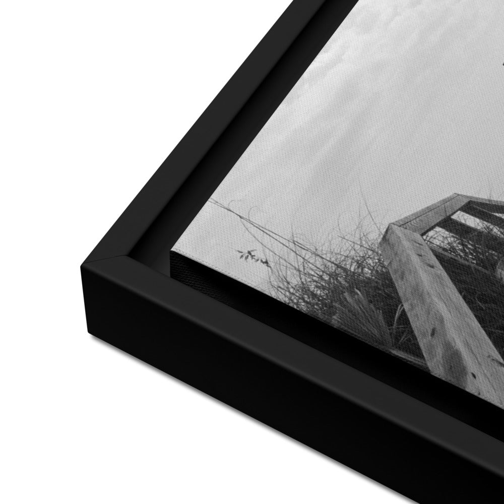 You'll receive a gallery-quality black and white 35mm photograph printed on canvas, stretched and mounted in a sleek black frame, creating a striking floating effect.