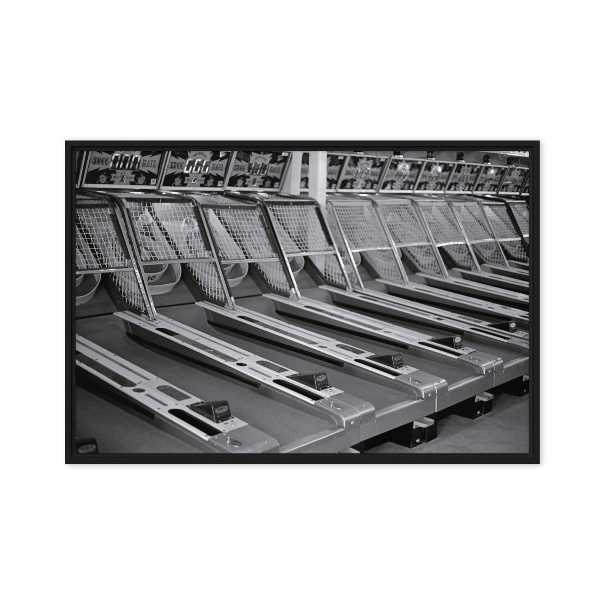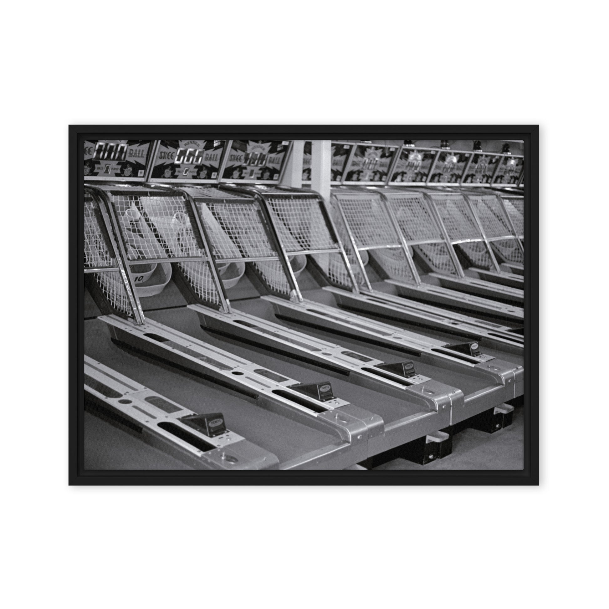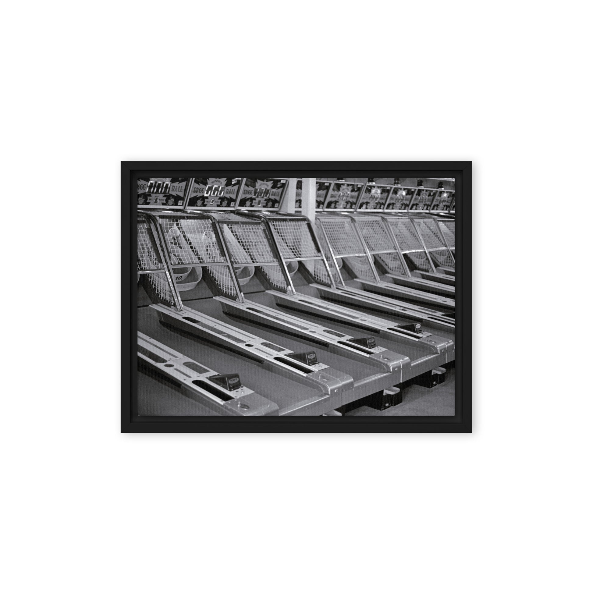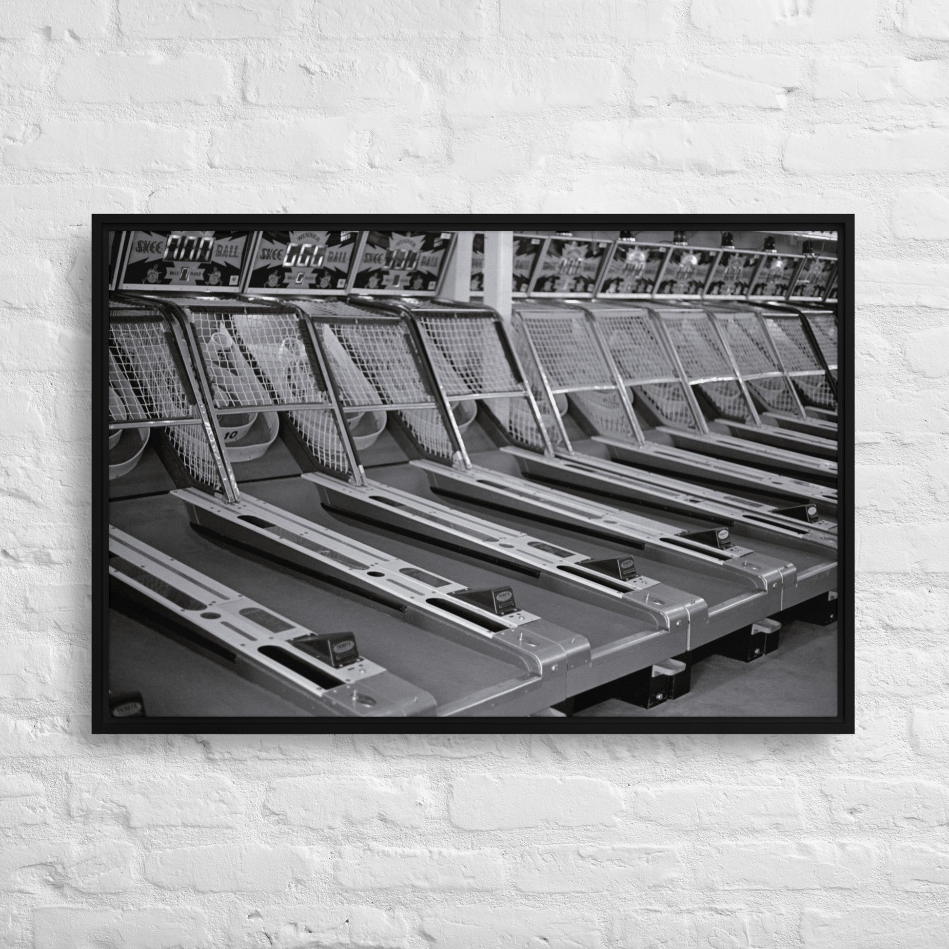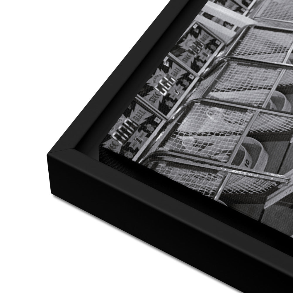You'll receive a gallery-quality black and white 35mm photograph printed on canvas, stretched and mounted in a sleek black frame, creating a striking floating effect.