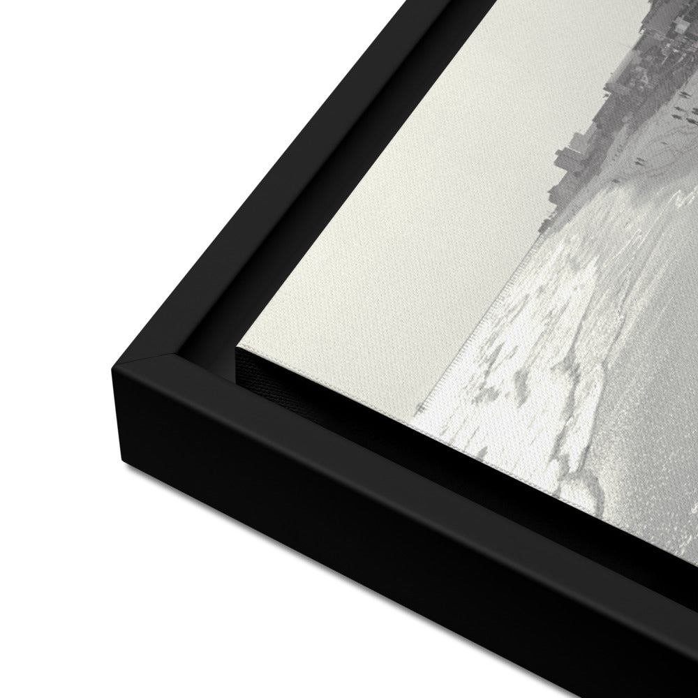 You'll receive a gallery-quality black and white 35mm photograph printed on canvas, stretched and mounted in a sleek black frame, creating a striking floating effect.