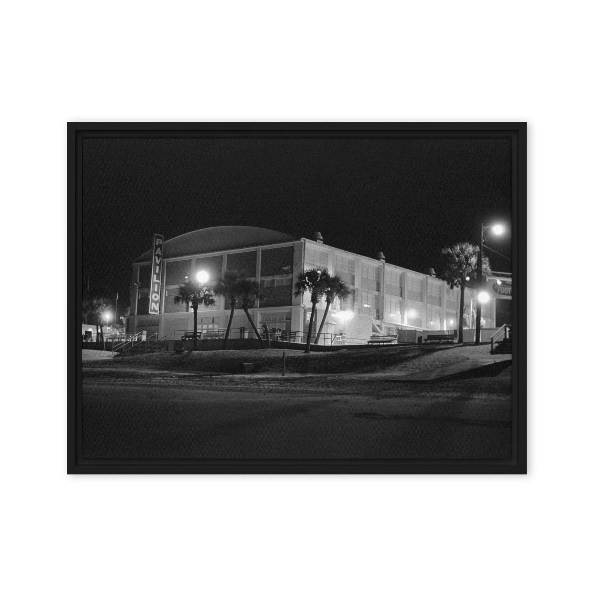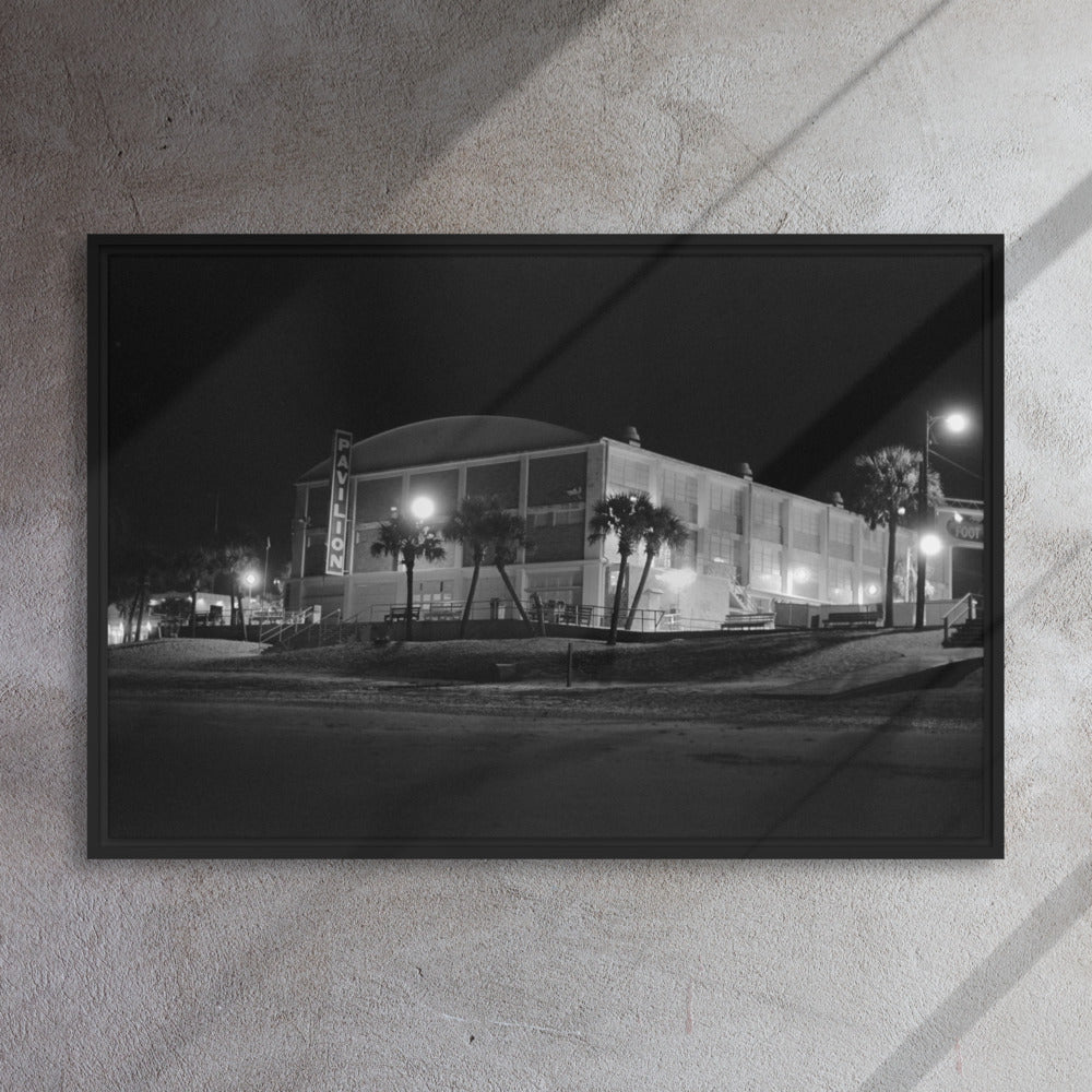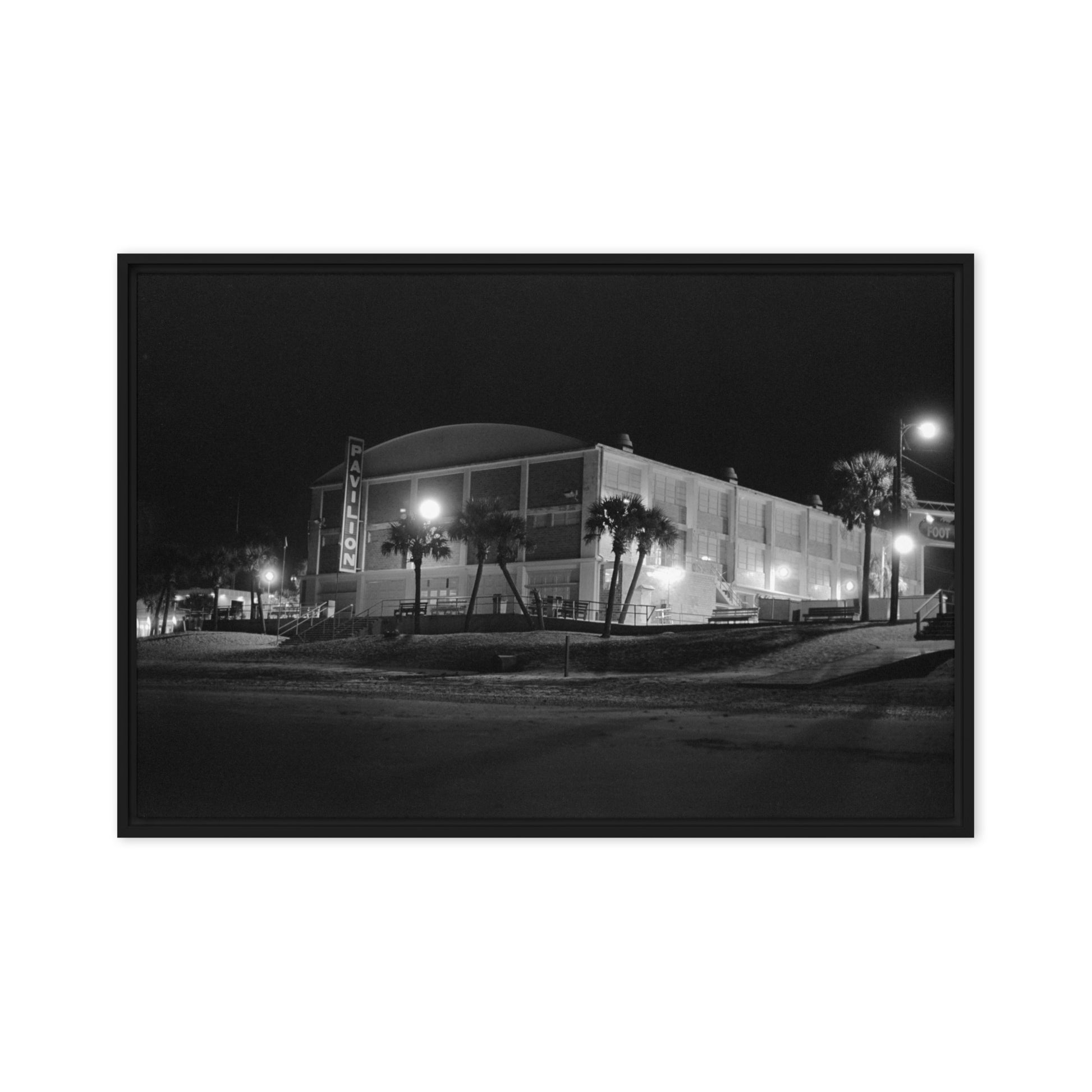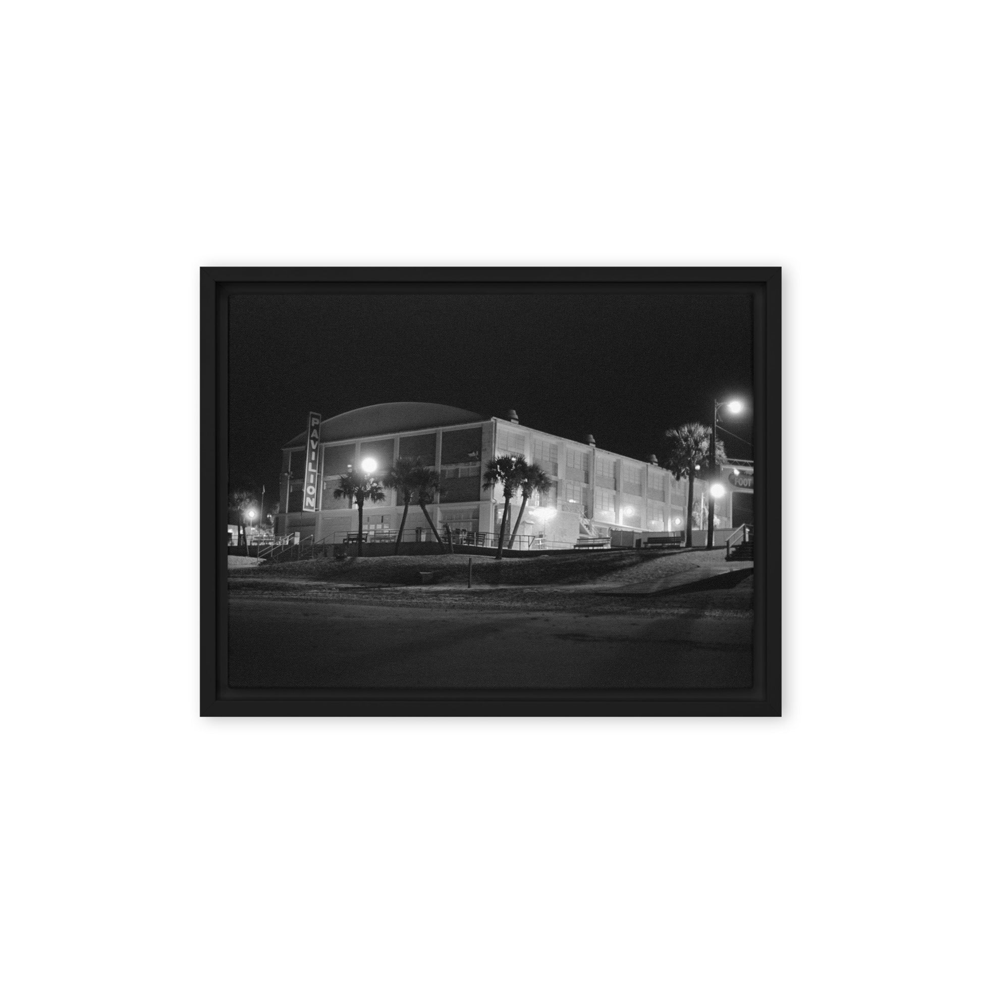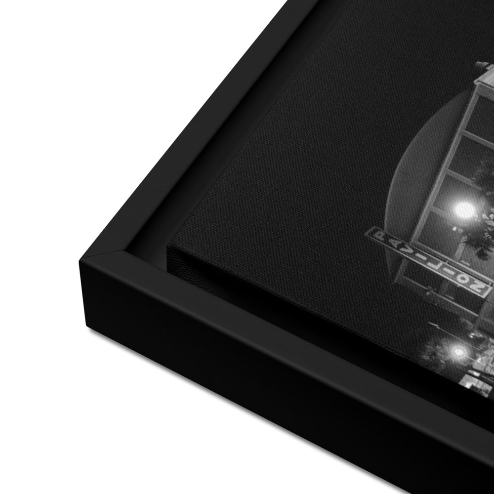 You'll receive a gallery-quality black and white 35mm photograph printed on canvas, stretched and mounted in a sleek black frame, creating a striking floating effect.