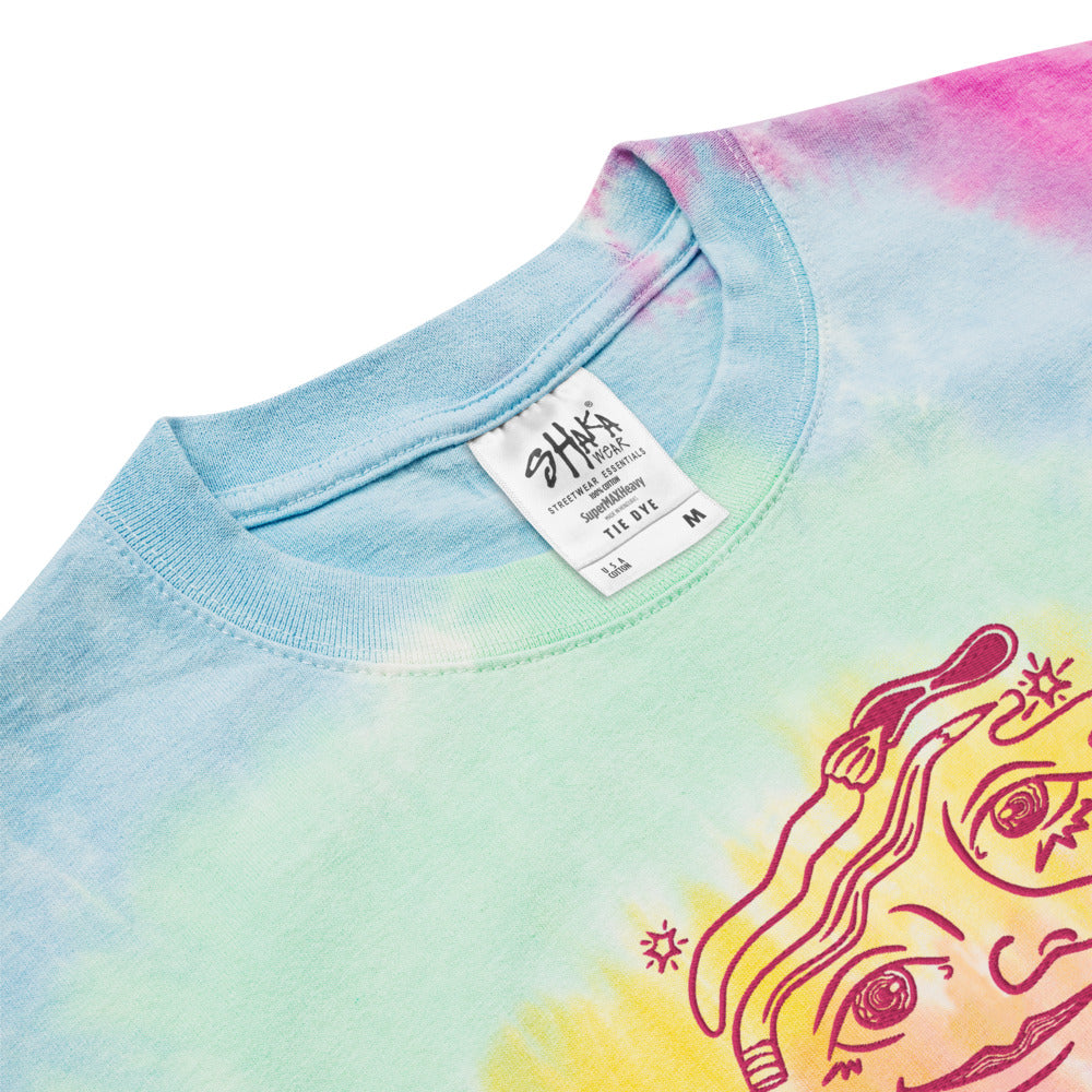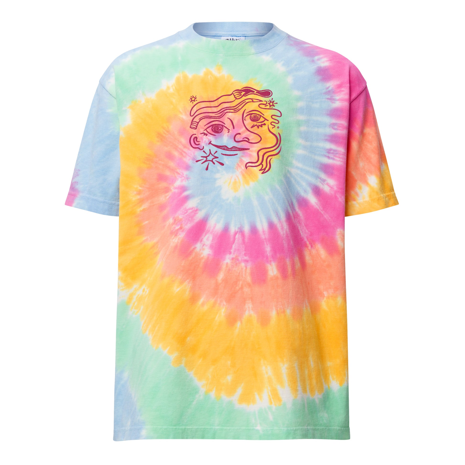 This oversized tie-dye t-shirt is for when your mind is a kaleidoscope of ideas and your wardrobe needs to match. This shirt is a psychedelic trip, with its sunburst tie-dye and embroidered figure grooving on a cosmic wave of inspiration. The tee has a cool, relaxed fit and is highly durable thanks to its heavy weight cotton material. Wear it with your favorite bell-bottoms!
