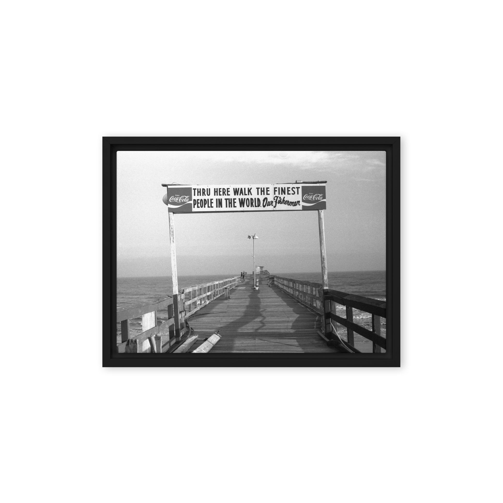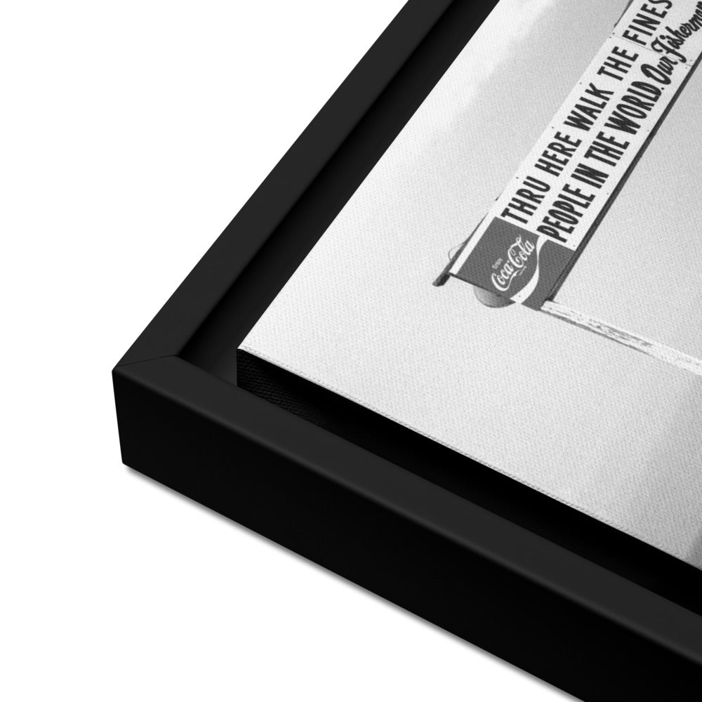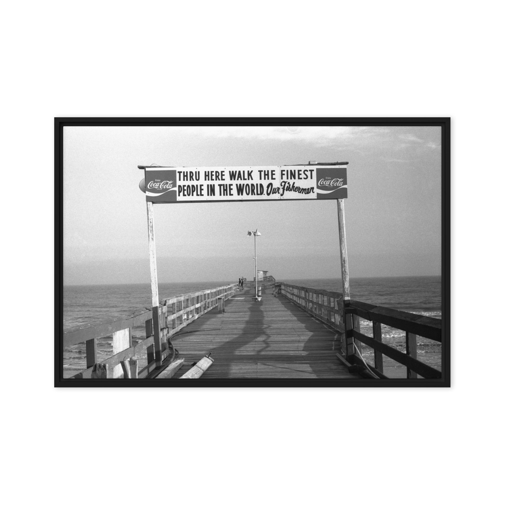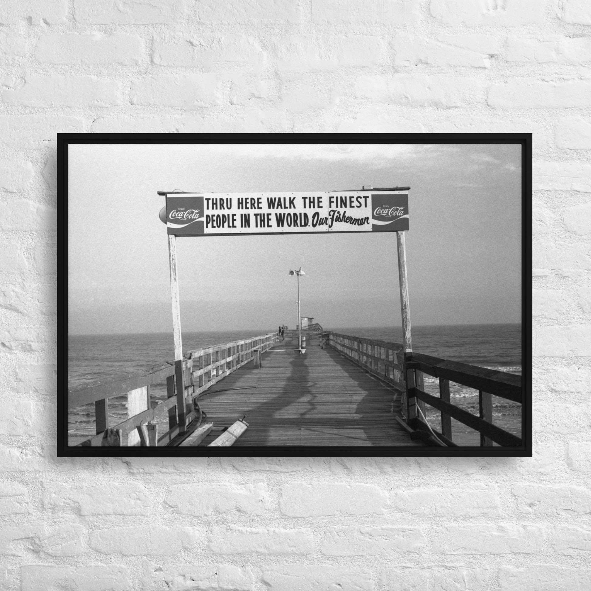 You'll receive a gallery-quality black and white 35mm photograph printed on canvas, stretched and mounted in a sleek black frame, creating a striking floating effect.